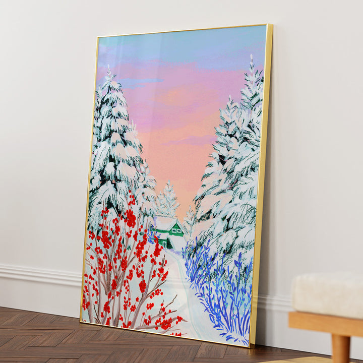 winter landscape wall art, snowy forest painting, cozy cabin poster, sunset wall decor, pastel winter art, nature landscape canvas, Scandinavian wall print, peaceful home décor