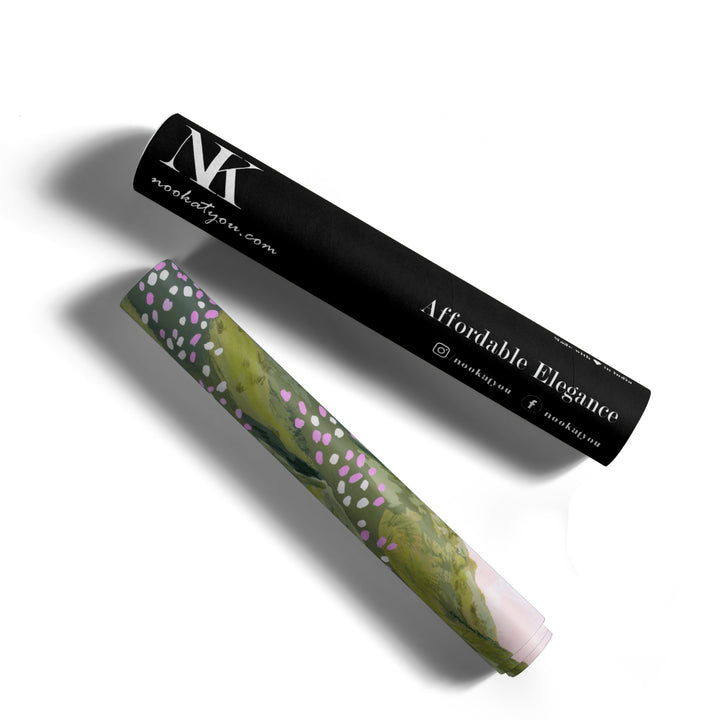- Warm & Inviting Colors – pink skies and green hills create soothing harmony