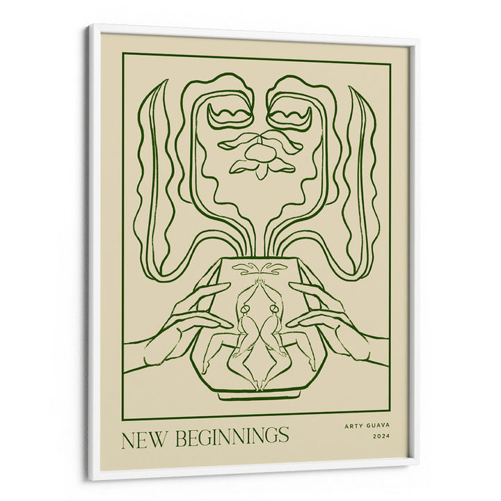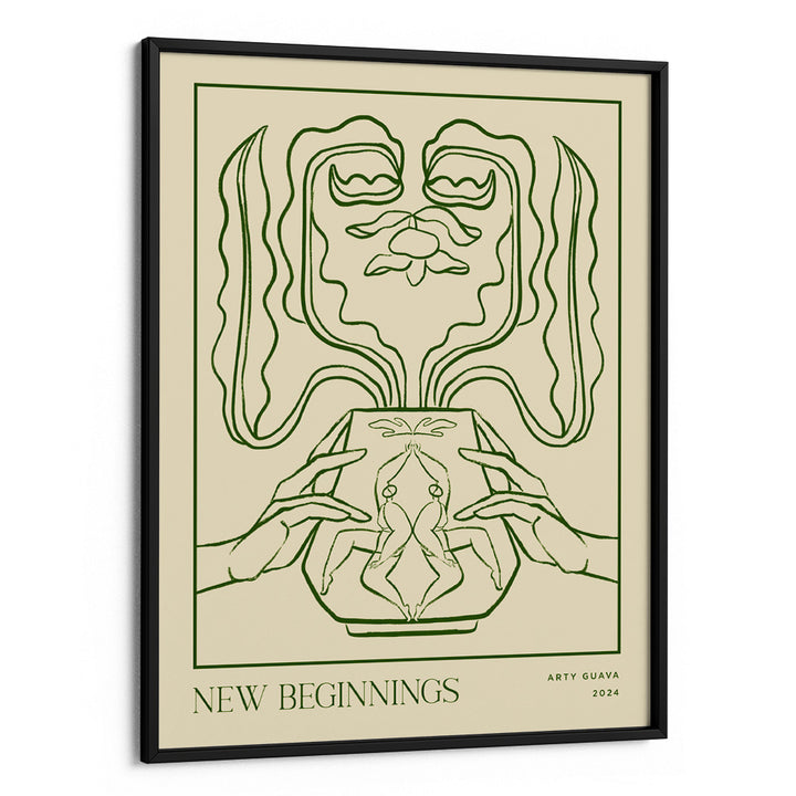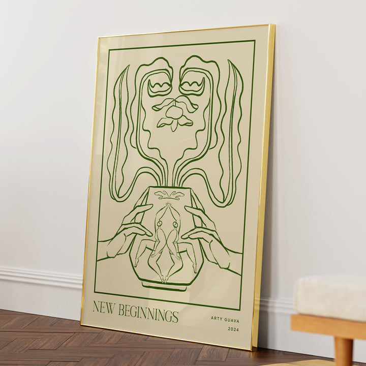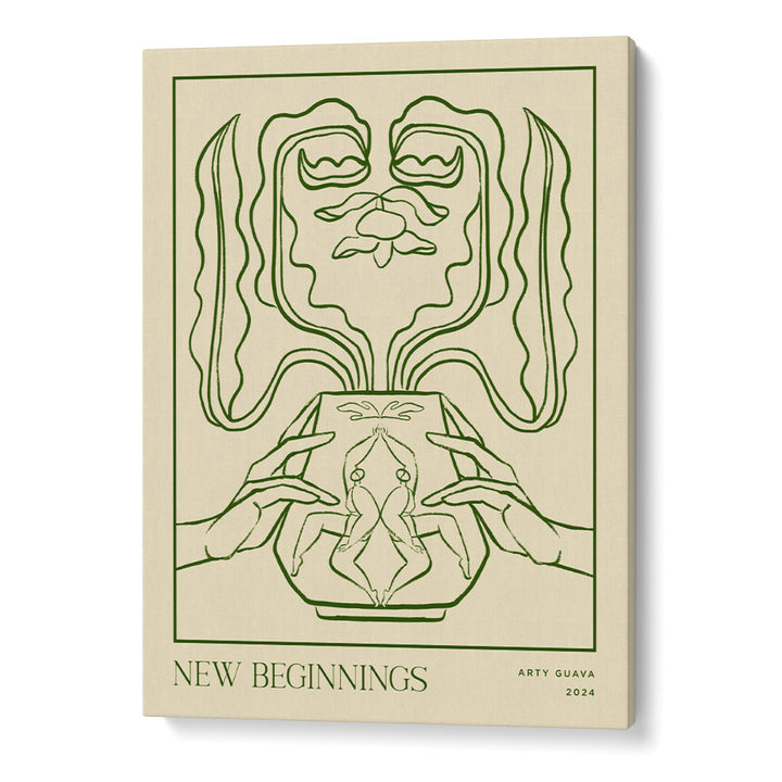 Start fresh with New Beginnings, a symbolic canvas painting that blends surrealist line art with emotional depth. Featuring two intertwined figures inside a vase, sprouting abstract foliage above, this piece explores duality, rebirth, and inner peace. With bold green linework set against a raw beige canvas texture, it's perfect for spaces where intention meets artistry—whether it’s your reading nook, yoga corner, or creative studio.