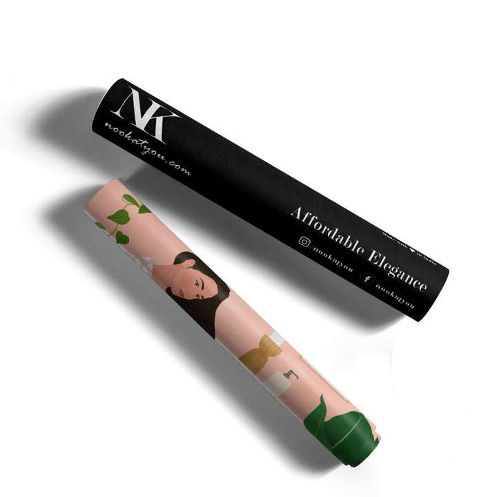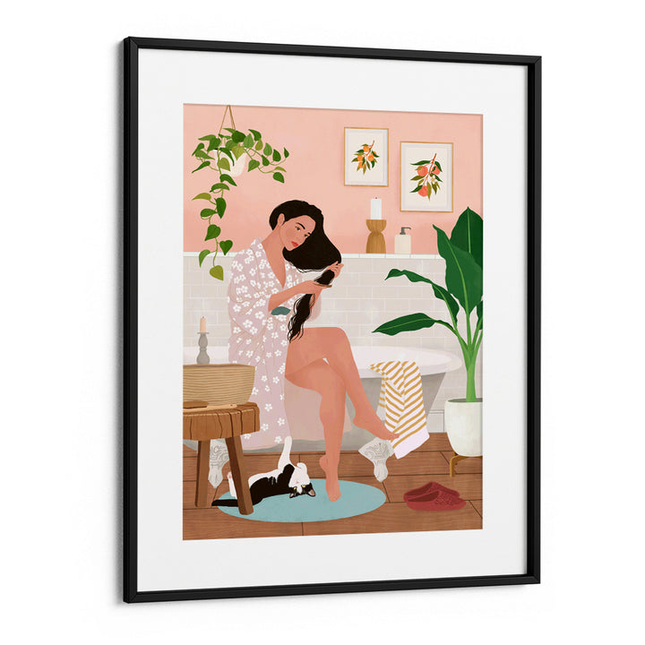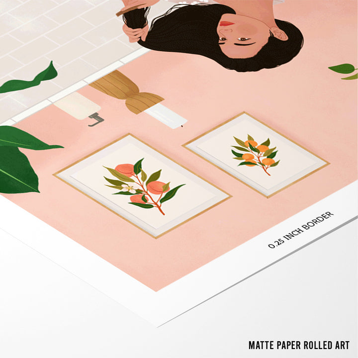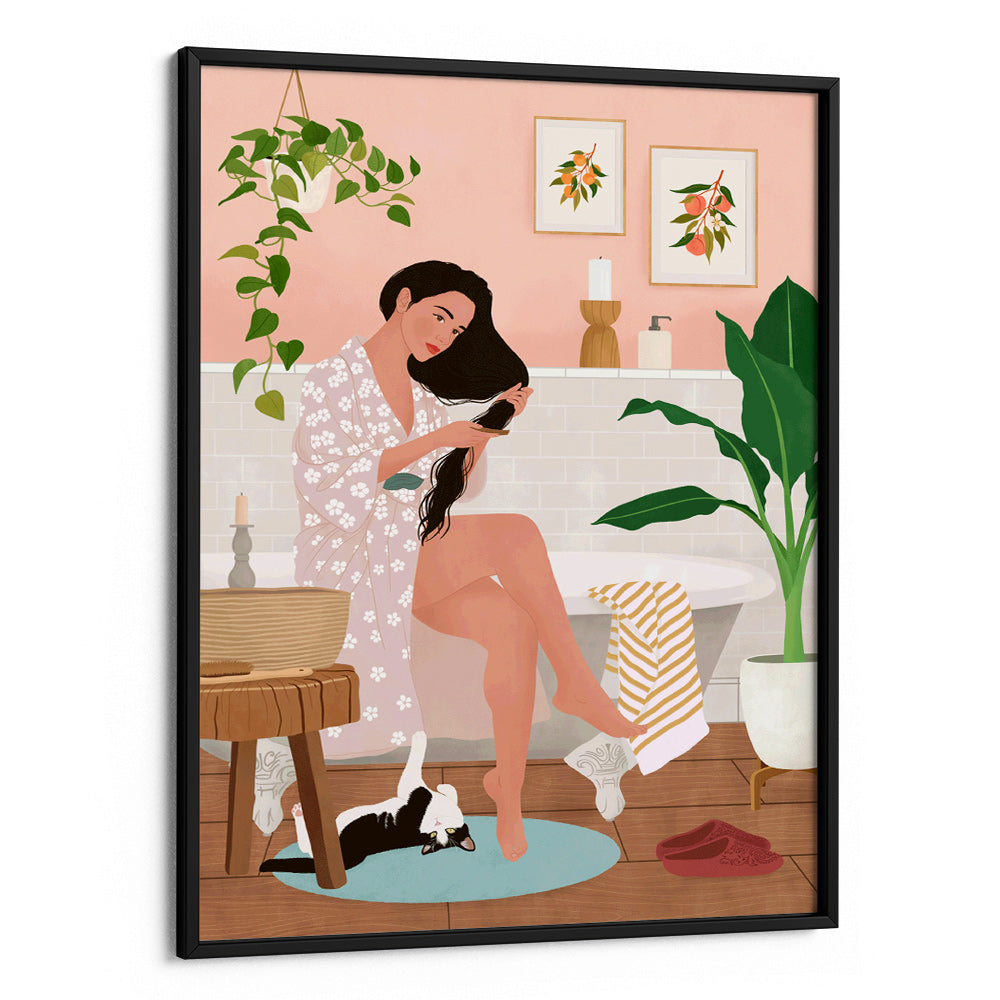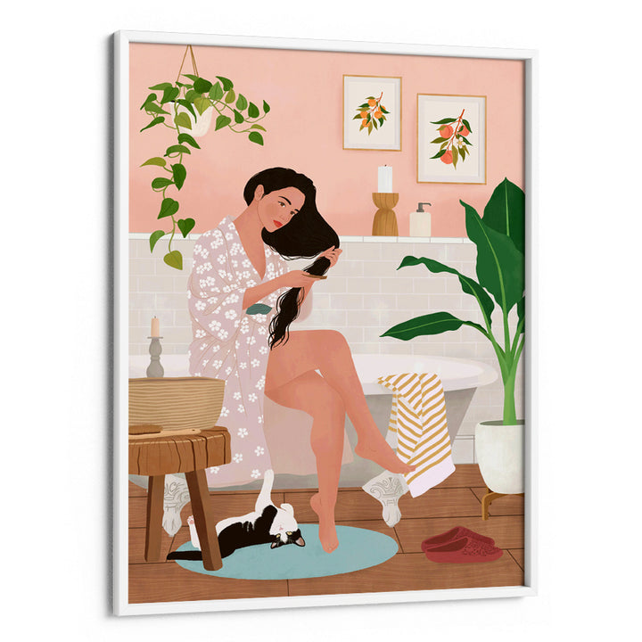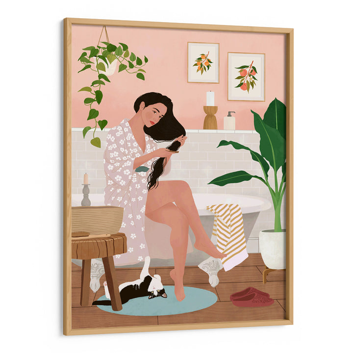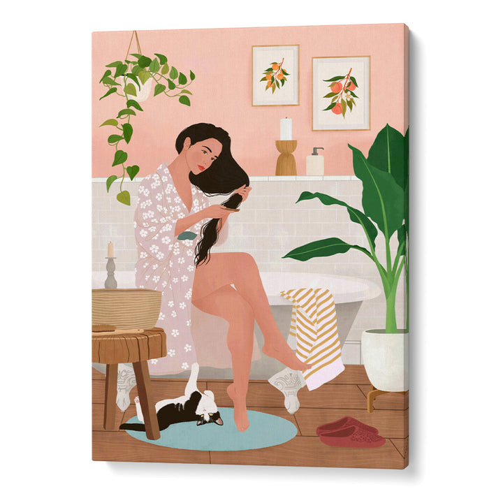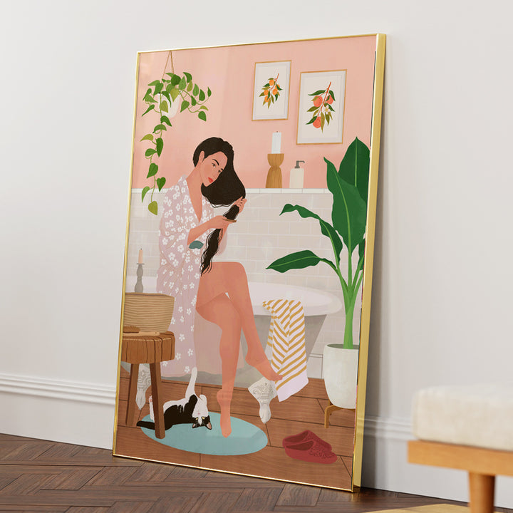 Capture calm, self-care, and quiet beauty with After a Bath, a delightful canvas print that celebrates feminine rituals and cozy interiors. Set in a soothing pastel bathroom with indoor plants, framed art, and soft lighting, this wall art gently tells the story of post-shower bliss. The elegant figure combing her hair with a curious black-and-white cat at her feet adds charm, comfort, and character to modern Indian homes. Perfect for bathrooms, dressing corners, or spaces that deserve a soft, grounding moment.