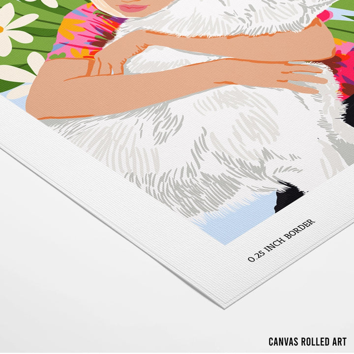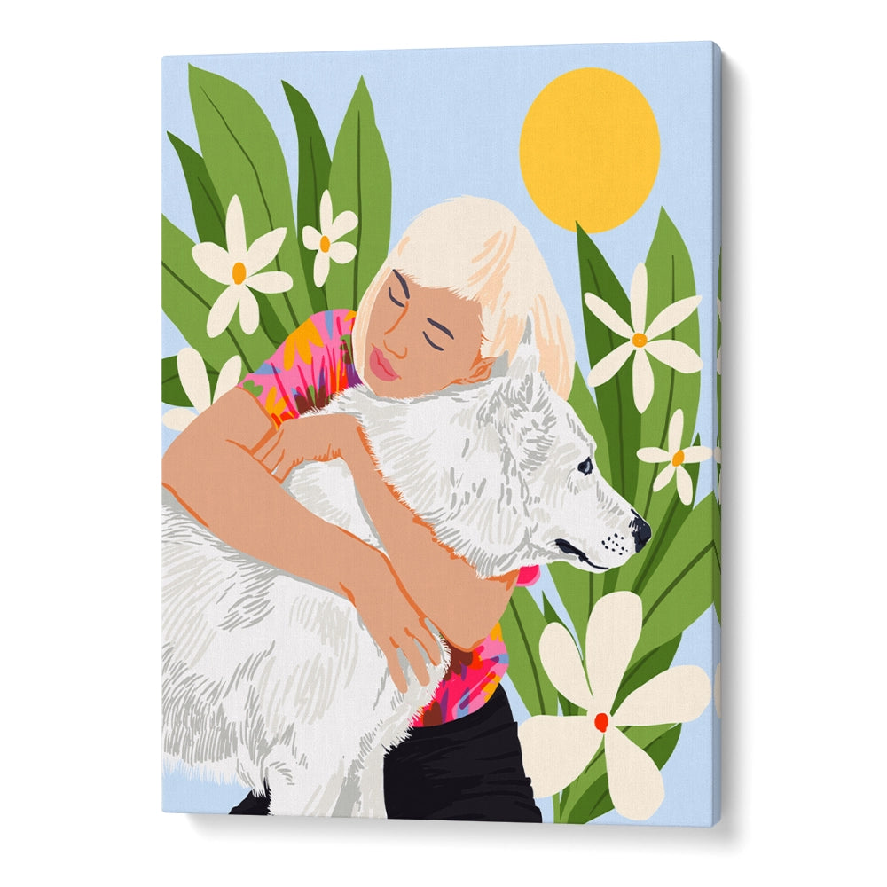 Celebrate unconditional love with All You Need Is Love and a Dog, a warm and expressive boho-style canvas print. Featuring a woman embracing her loyal dog against a backdrop of tropical leaves, sunshine, and blooming florals, this artwork radiates comfort, joy, and emotional connection. With soft textures, bold colors, and a dreamy illustrated style, it’s the perfect piece to uplift bedrooms, living rooms, pet corners, or cozy reading nooks.