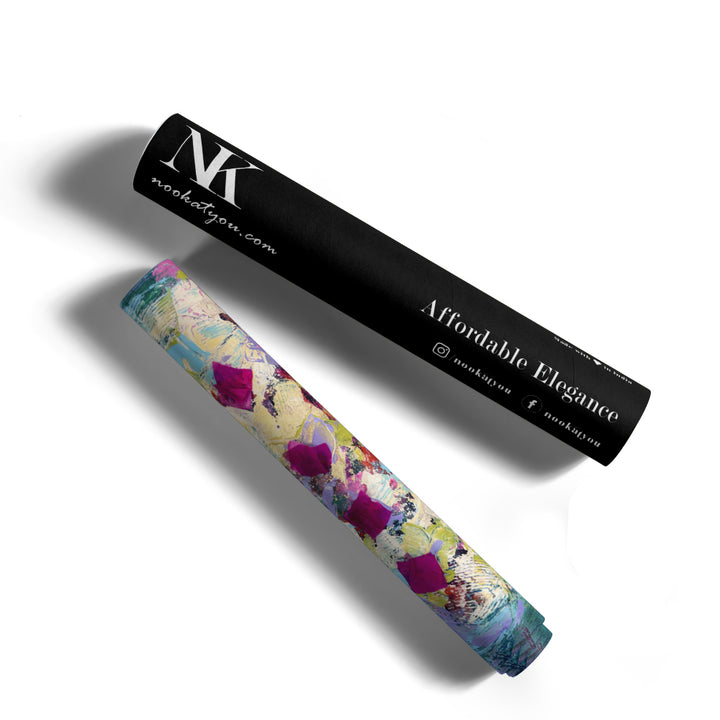Use Among Roses as the color inspiration for a room, pulling out the magenta, yellow, and blue accents in soft furnishings. It creates a stunning visual rhythm when paired with other geometric art prints or solid-color abstract wall art.