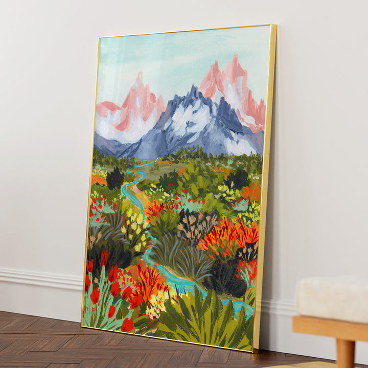 Celebrate the rich colors of the season with the Autumn Mountains Landscape Art Print. This dynamic artwork showcases a majestic mountain range—including peaks with striking pink and coral accents towering over a valley filled with fiery foliage. A winding blue river guides the eye through a lush foreground of red, orange, and golden brushstrokes. The painting style is expressive and bold, making it a perfect statement piece for capturing the warmth of autumn and the grandeur of nature in your living room, dining area, or cozy study.