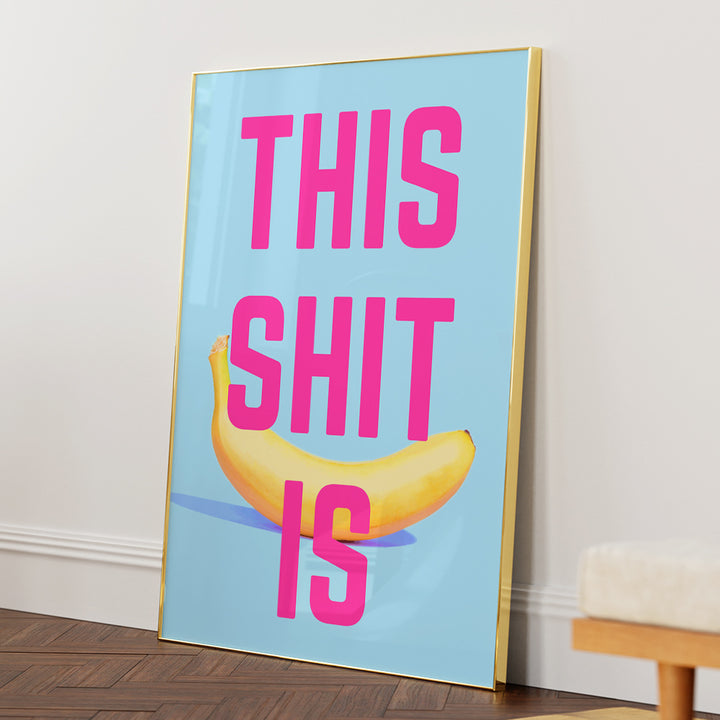 Inject some unapologetic humor and bold color into your space with the Bold Banana Statement art print. This vertical Pop Art poster features a realistic banana on a bright blue background, framed by oversized, shocking neon pink text. It's a playful, irreverent, and highly graphic piece perfect for making a humorous statement in a kitchen, dining room, or casual living area. Embrace the bold and the beautiful!