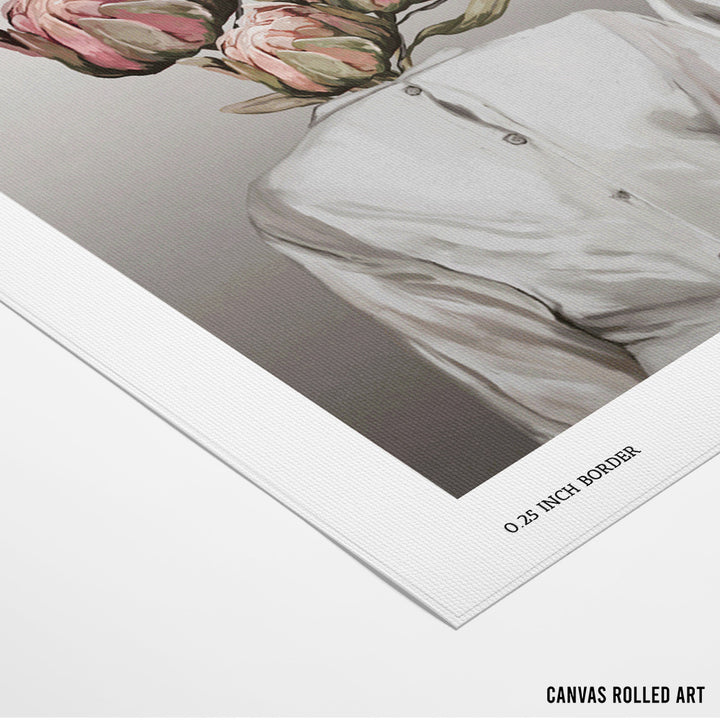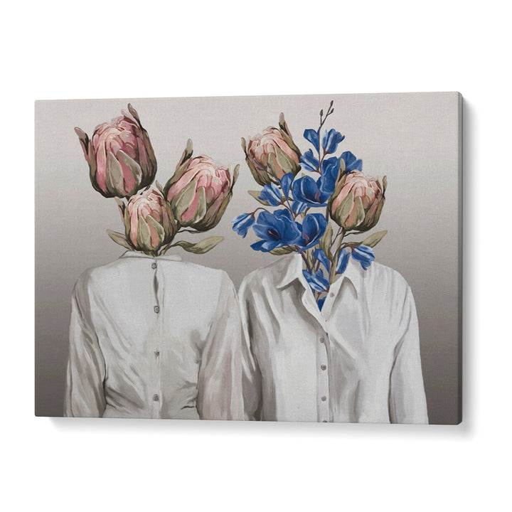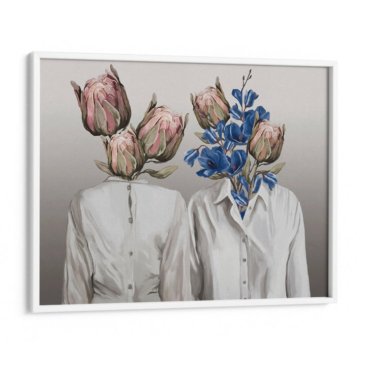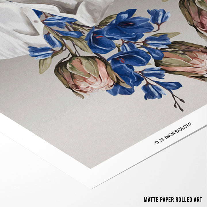 Explore connection and identity with Botanical Souls, a captivating surrealist wall art poster. This unique piece features two figures, symbolizing human relationships, whose heads are replaced by lush, vibrant floral arrangements—including pink Proteas and striking blue bellflowers. The contrasting elements of crisp white shirts and expressive botanical forms create a visually stunning metaphor for nature, duality, and inner self. This poster is perfect for eclectic, modern, and feminine spaces seeking art with both aesthetic beauty and symbolic depth.