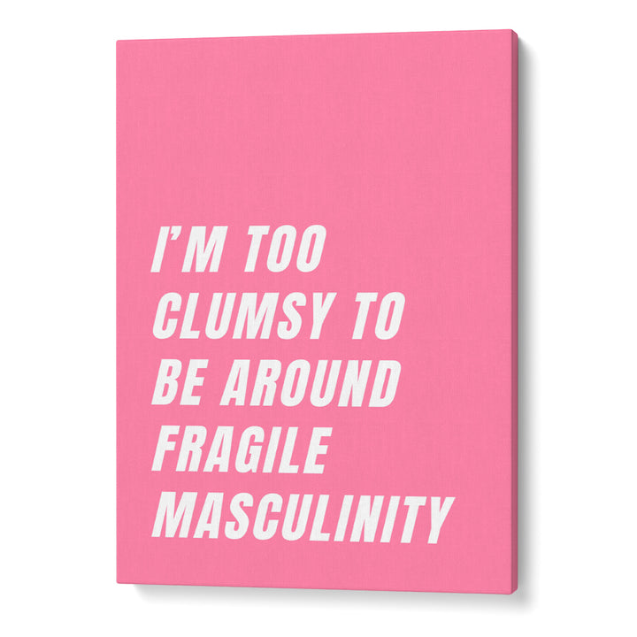 Make an unmissable, witty statement with the Clumsy Meets Fragility wall art print. This bold typography poster features the impactful quote, "I'M TOO CLUMSY TO BE AROUND FRAGILE MASCULINITY", set in crisp white text against a striking hot pink background. It's a humorous and contemporary piece perfect for expressing modern views in a bedroom, home office, or gallery wall. This art print instantly adds a touch of boldness, humor, and conversation-starting energy to your space.