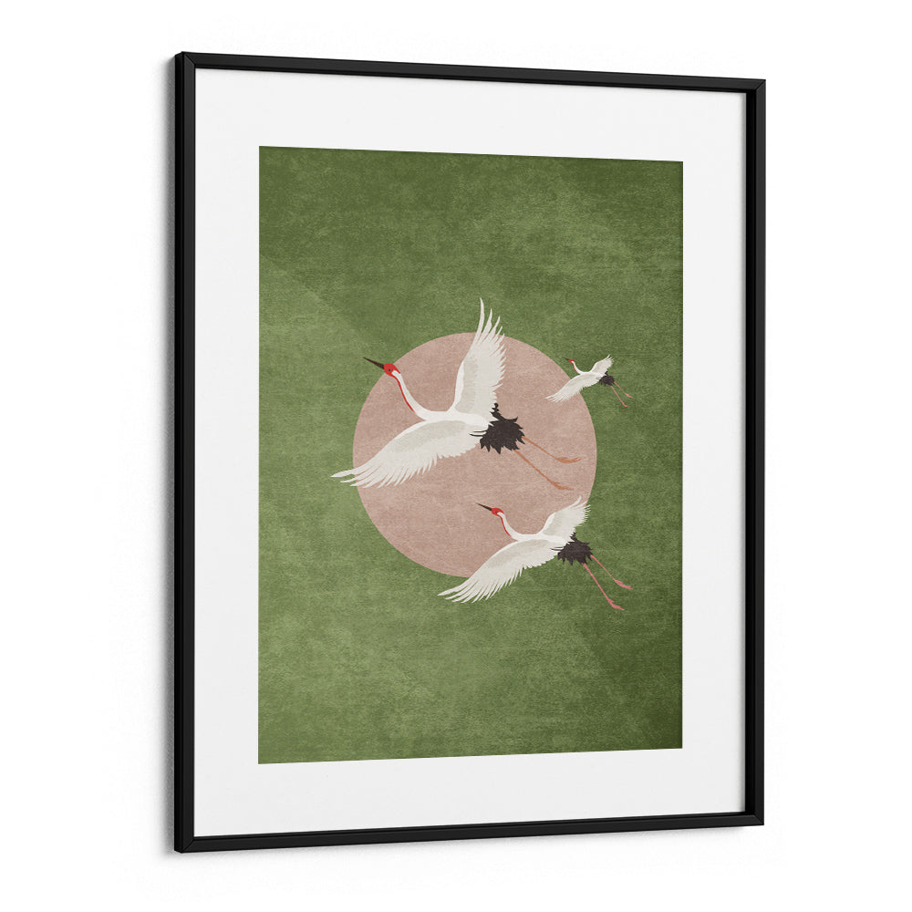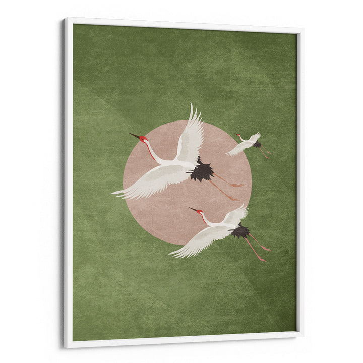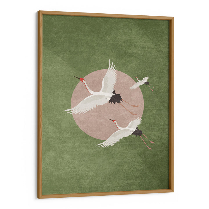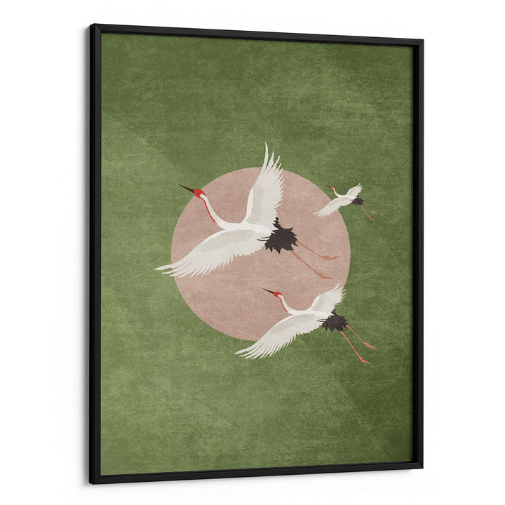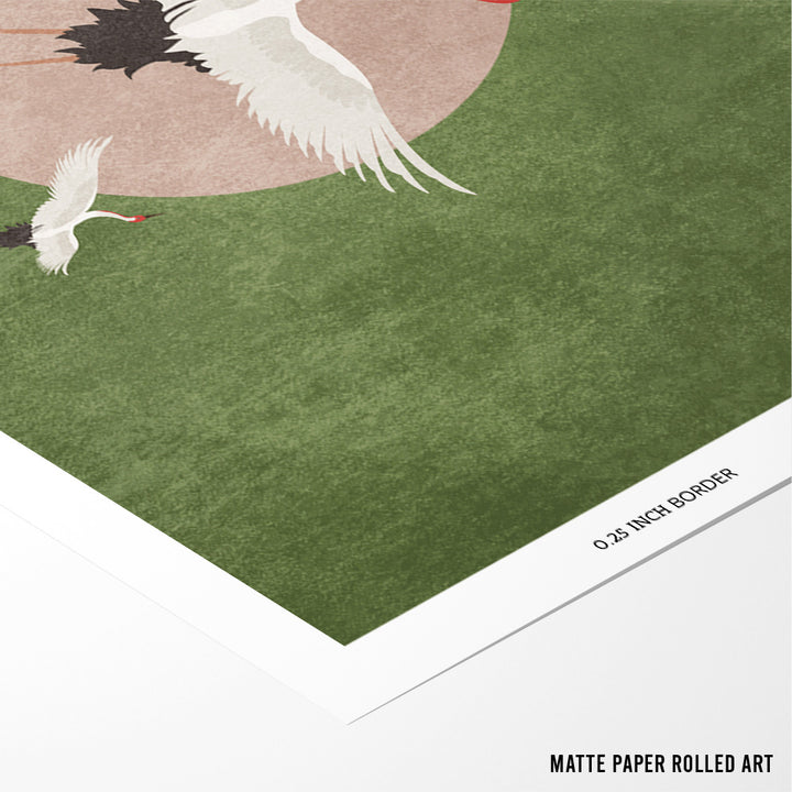 cranes in flight art, green abstract wall art, asian inspired print, minimalist bird art, serene wall decor, feng shui art, nature abstract, pink and green art, spiritual home decor