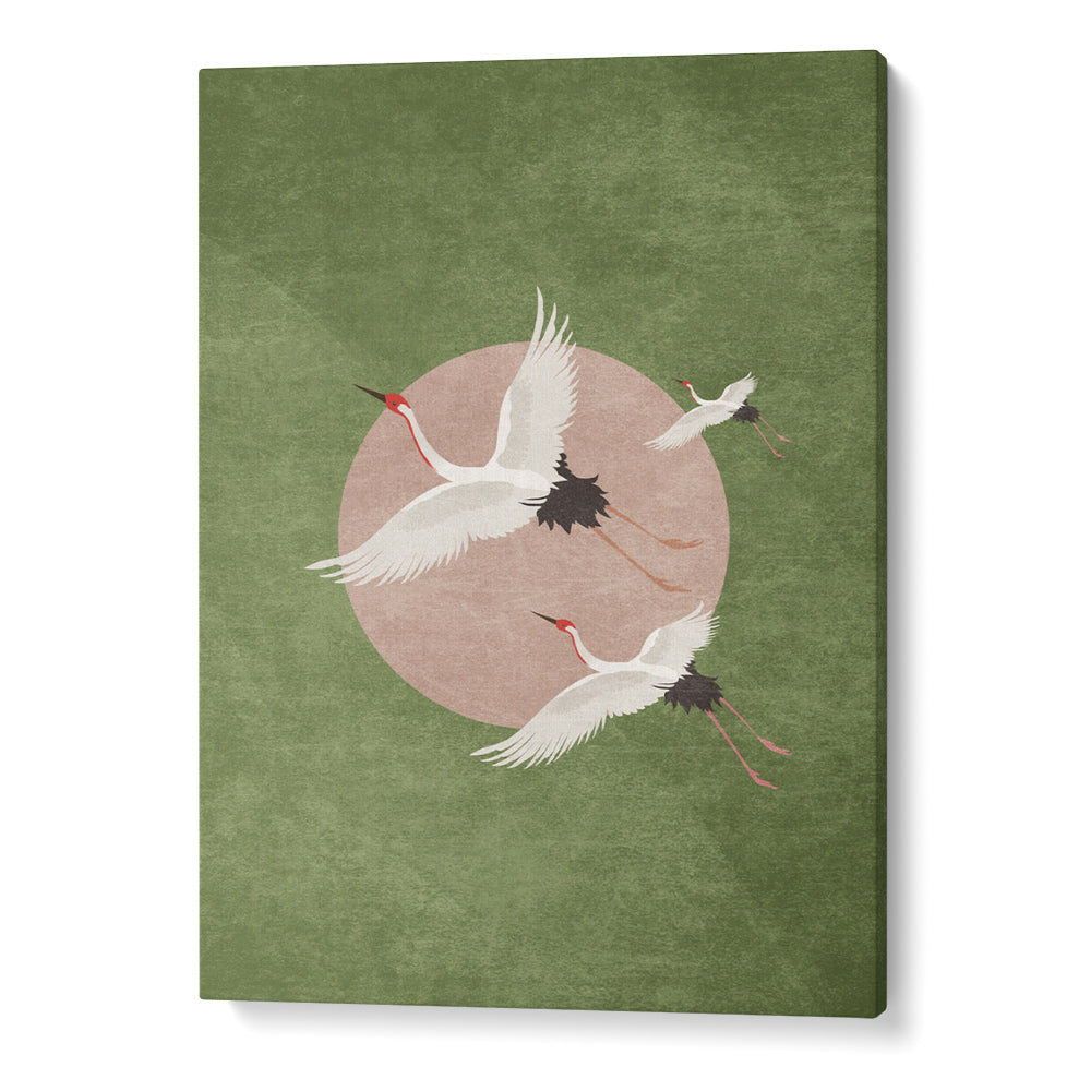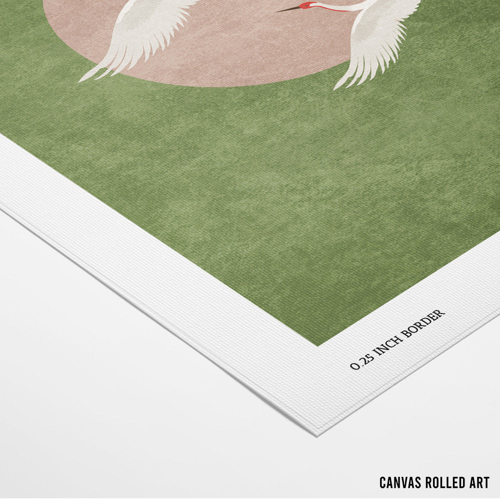 Embrace serenity and timeless beauty with Cranes in Flight - Green. This elegant abstract art piece features three gracefully stylized white cranes soaring against a muted olive green backdrop, highlighted by a soft pink sun or moon motif. The minimalist design draws inspiration from traditional Asian art, symbolizing longevity, good fortune, and peace. With its soothing color palette and fluid lines, this canvas print is perfect for creating a calm and sophisticated atmosphere in your living room, bedroom, or meditation space.