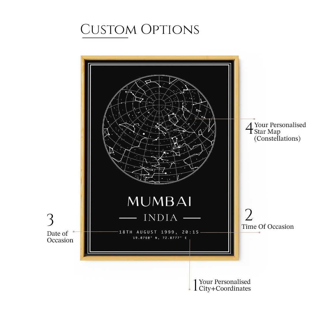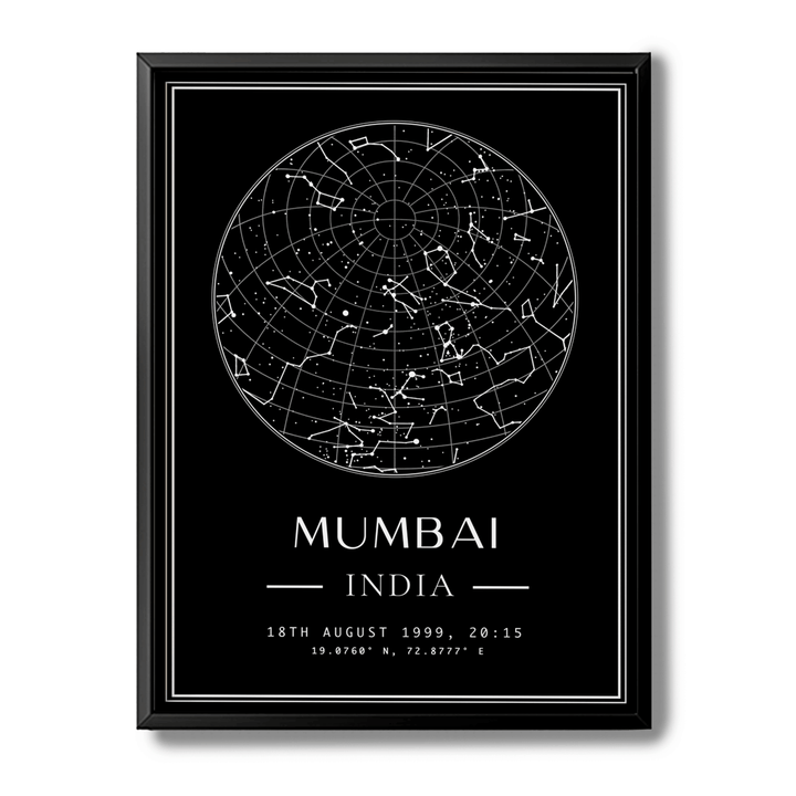 Relive the magic of a moment with a Custom Star Map print. This personalized artwork accurately charts the constellation arrangement from your chosen location, date, and time. The **Classic Black** design offers a timeless, elegant look, showcasing the stars exactly as they appeared overhead on your special night in cities like Chennai. It's the perfect gift to capture a birth, engagement, or wedding under the stars.