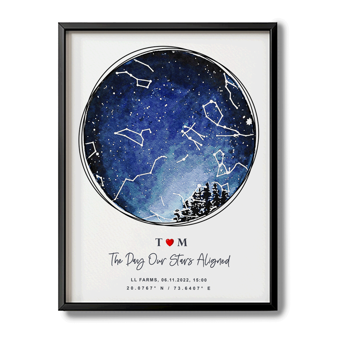 Capture the magic of your special night with a custom sky map. This Starry Night edition recreates the constellations and stars exactly as they appeared on your chosen date and location. A timeless keepsake for love stories, milestones, and celebrations.