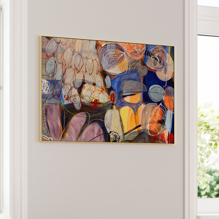 Dive into the emotional depth of Dear Diary II, a powerful abstract expressionist painting. This piece features a striking composition built on deep layers of black and various shades of vibrant blue, cut through with dynamic strokes of red, yellow, and white. Energetic scribbled lines and fragmented shapes create a sense of movement and introspection, evoking the tumultuous yet beautiful nature of inner dialogue. It's an ideal statement piece for modern, artistic spaces—whether it’s a creative studio, a chic office, or a contemporary living area.