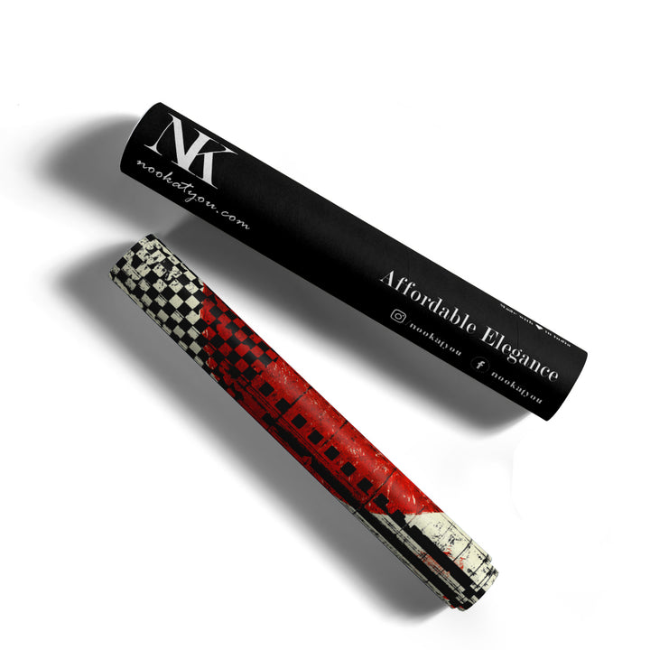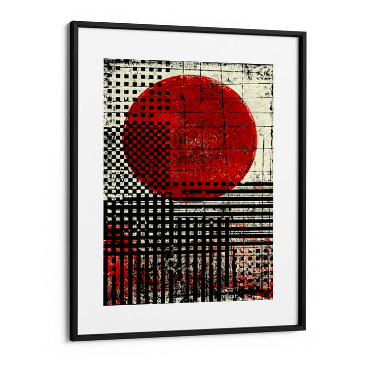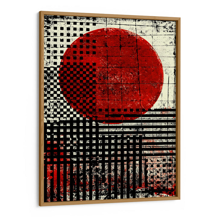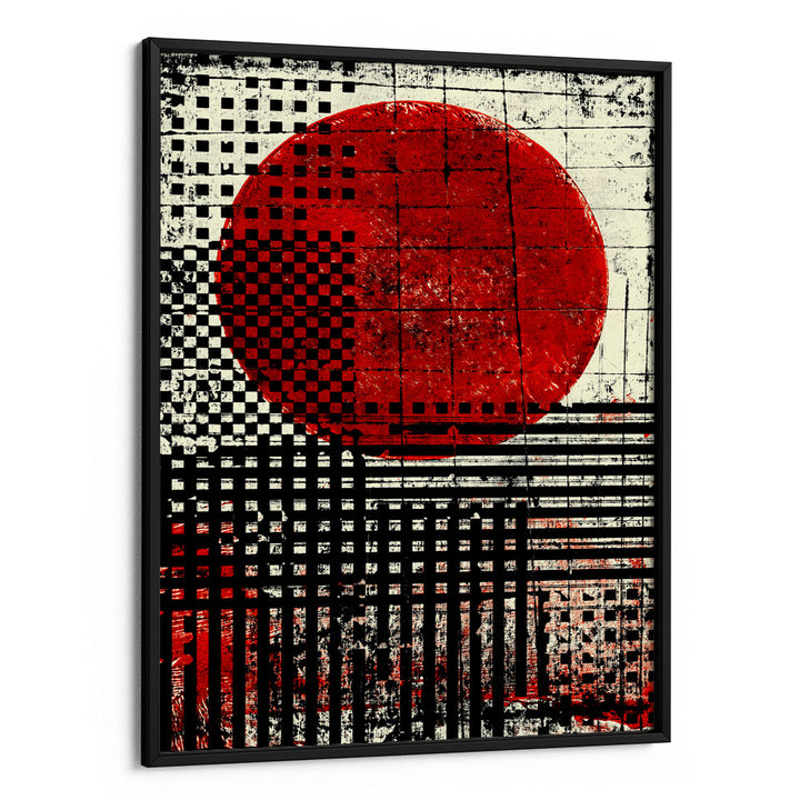 Command attention with the Empire Sun canvas painting, a powerful piece of graphic abstract art. Inspired by the Japanese flag, this artwork features a bold, distressed red circle set against a striking background of black and white geometric patterns, including checkerboards and vertical stripes. The vintage, textured finish gives the modern graphic design an edgy, urban feel. This high-contrast piece is an immediate focal point, ideal for industrial, contemporary, or minimalist spaces that require a dramatic visual statement.