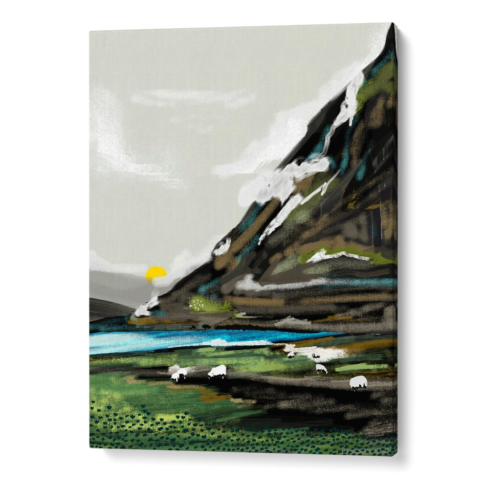 Landscape poster, nature wall art, serene canvas painting, sheep grazing art, mountain scenery print, calming home décor, muted color palette, modern landscape artwork