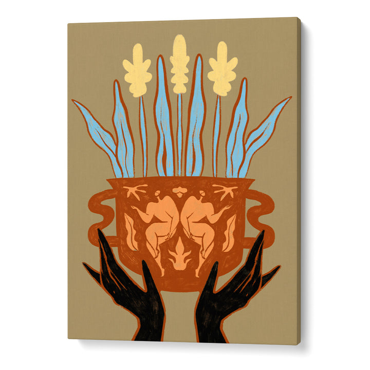 Celebrate the beauty of evolution with Growth, a symbolic wall art poster that merges earthy tones with bold surrealist imagery. Featuring mirrored human forms carved into a terracotta-style vessel, rising plants, and golden blooms, this artwork embodies renewal, resilience, and inner strength. Its natural palette of browns, yellows, and blues makes it the perfect statement piece for modern living rooms, cozy reading corners, and mindful interiors.