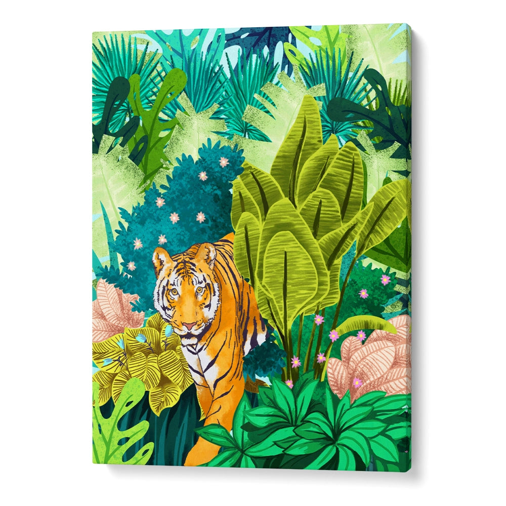 Botanical art prints, wildlife canvas painting, tropical jungle decor, tiger wall art, nature-inspired home decor, jungle theme artwork, modern botanical poster, vibrant green art