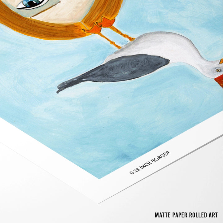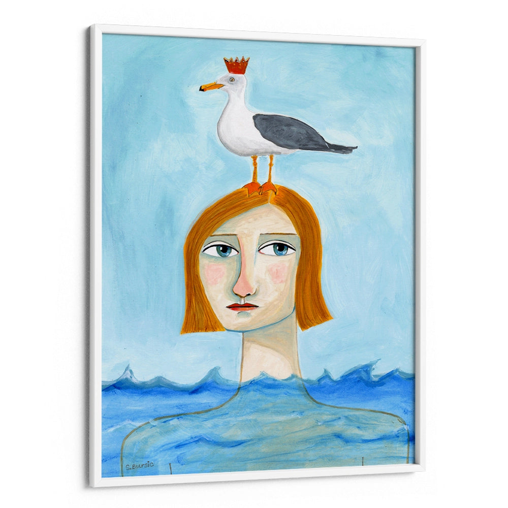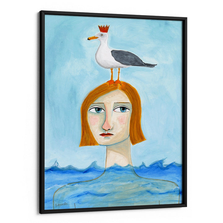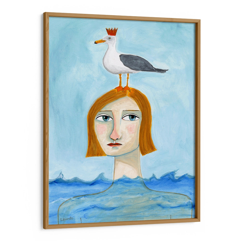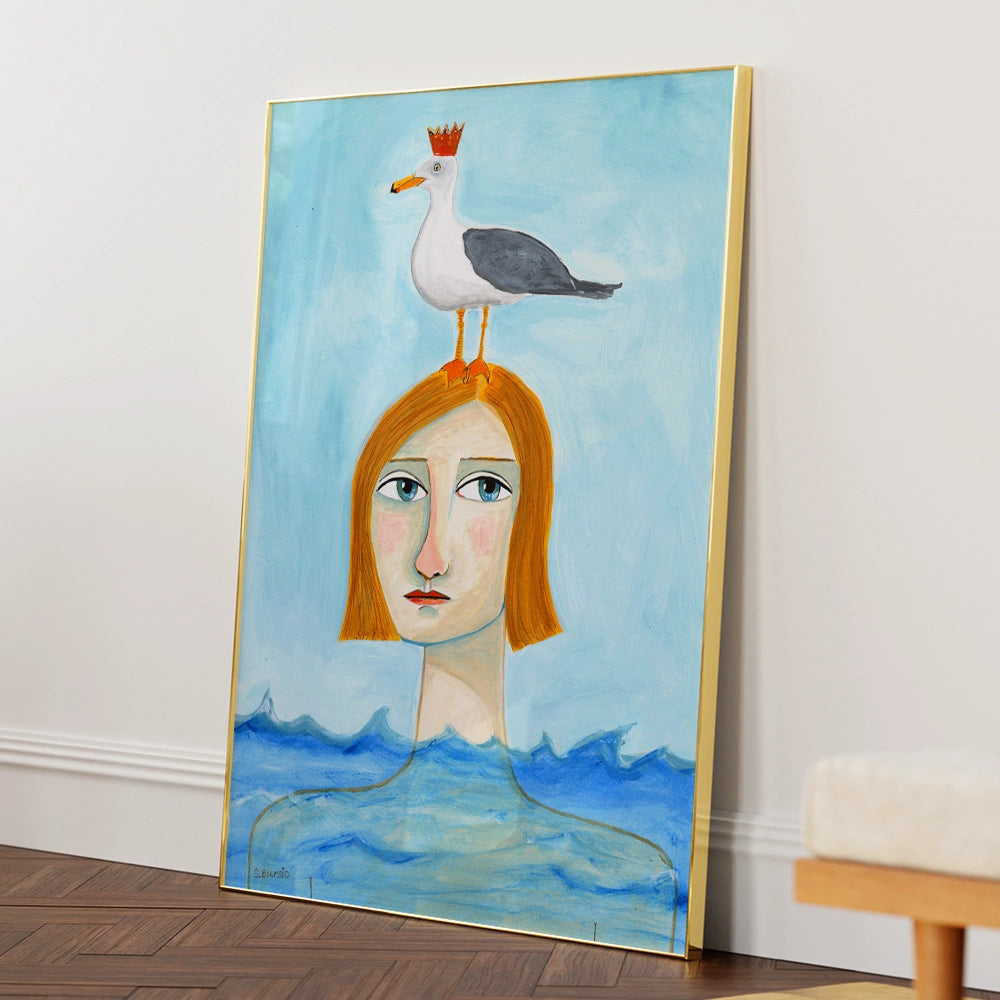Dreamlike and thought-provoking, Lady in Ocean is a striking Women illustration wall art print that blends surreal elements with calm coastal imagery. Featuring a composed figure emerging from the sea with a crowned bird perched above, this artwork evokes mystery, emotion, and quiet introspection.