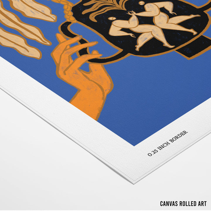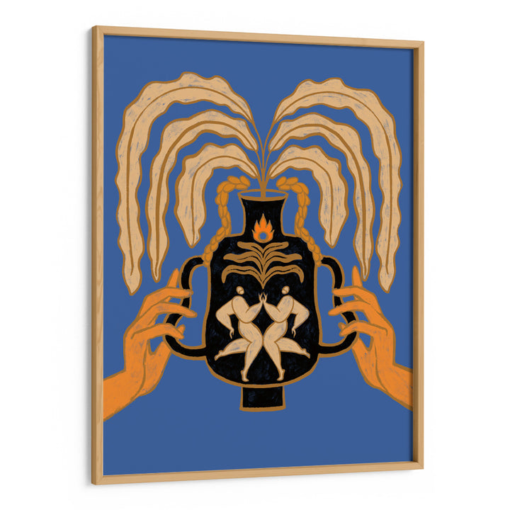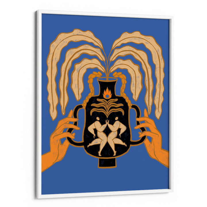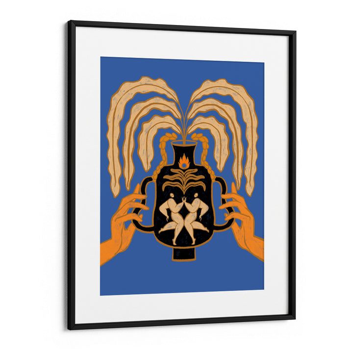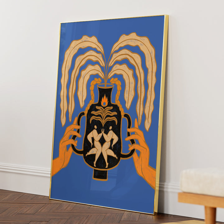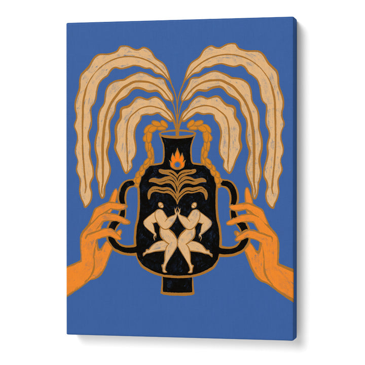 Celebrate togetherness with Let’s Meet Again, a striking canvas painting that explores human connection, renewal, and balance. Featuring two mirrored figures embraced inside a black vessel, with flowing golden foliage extending outward, this artwork symbolizes harmony, rebirth, and unity. Set against a bold blue backdrop with warm orange highlights, it creates an unforgettable visual statement for modern, eclectic, and soulful interiors.