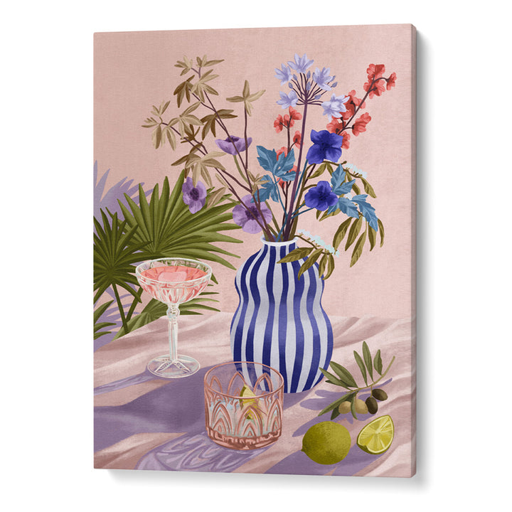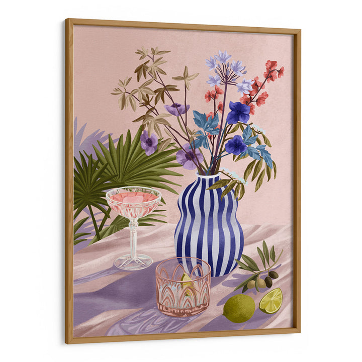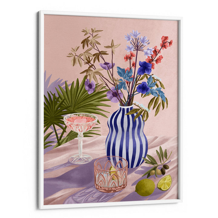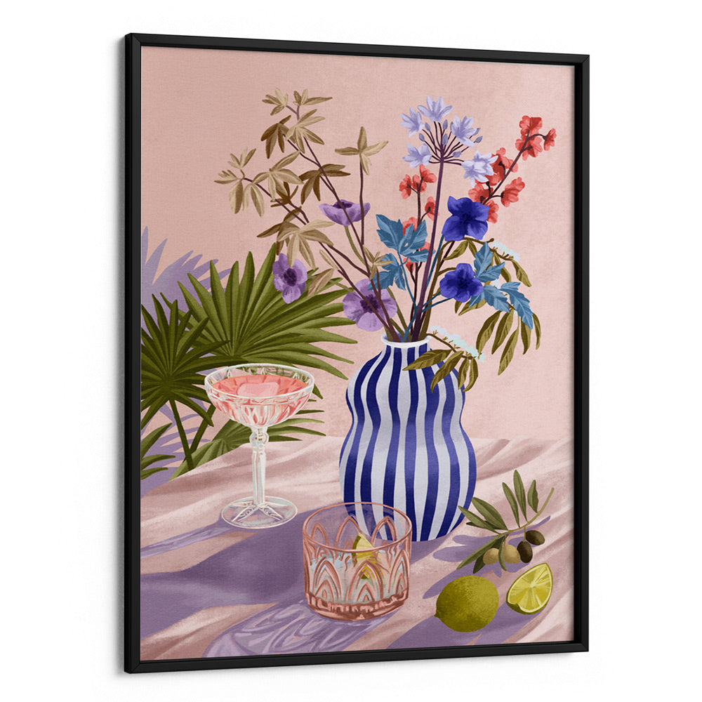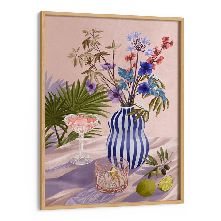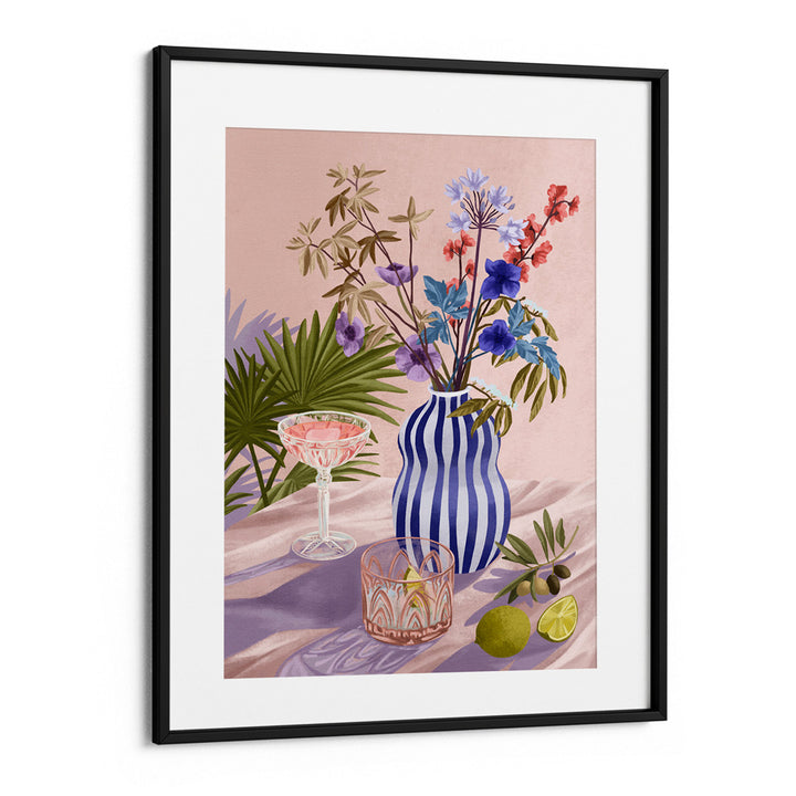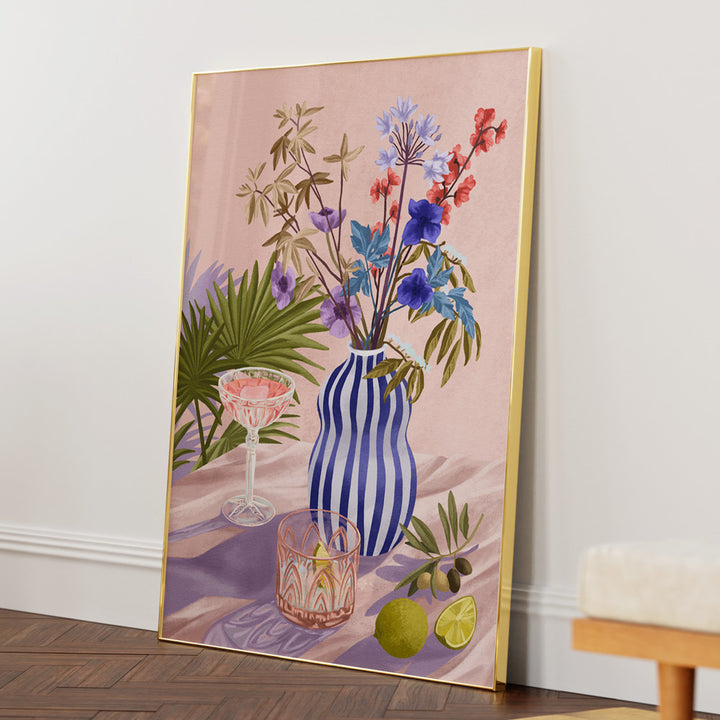 This stunning Aesthetic Wall Poster exudes charm and sophistication, featuring a striped blue vase filled with colorful wildflowers, accompanied by artistic glassware, limes, and olives on a soft fabric backdrop. The delicate balance of pastel pinks, deep blues, and lush greens makes this an ideal piece for a living room, dining space, or cozy corner. Perfect for those who appreciate botanical beauty and vintage aesthetics!