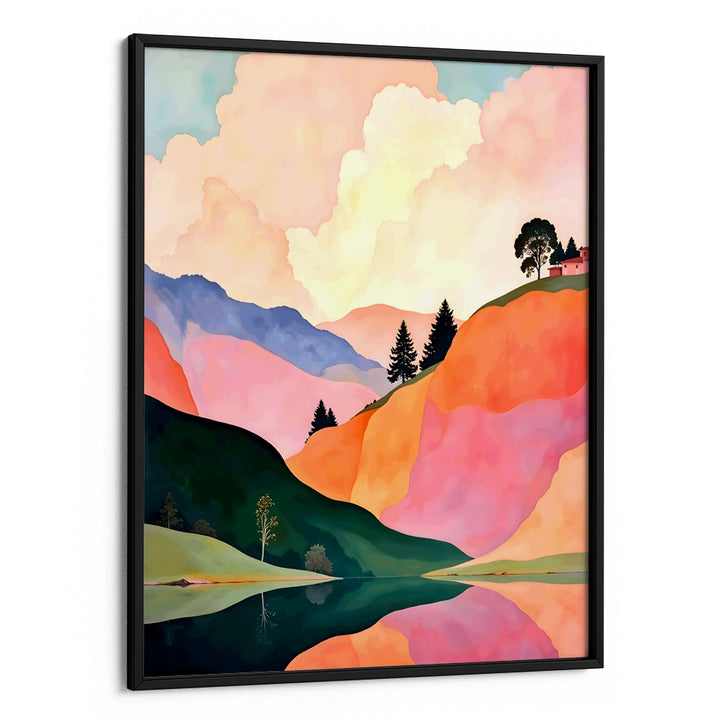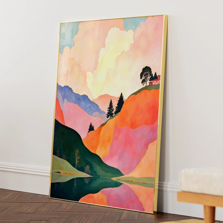 Fall in love with Love In the Air, a breathtaking pastel-filled landscape canvas print that blends romance, serenity, and artistic storytelling. With rolling pink and orange hills, misty blue mountains, peaceful water reflections, and a quaint cottage perched above, this artwork invites a sense of wonder and calm. Perfect for anyone seeking Landscape canvas prints that brighten interiors and create a dreamy atmosphere.