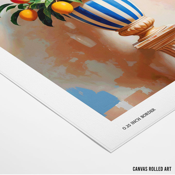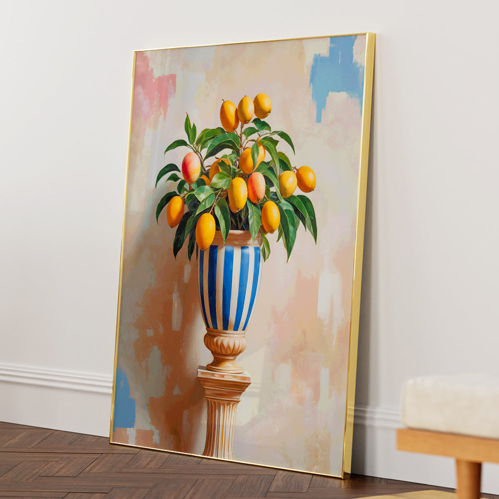 Capture the warmth and classic beauty of summer with Mango Summer. This stunning botanical wall art features a lush fruit-laden tree, likely a mango or citrus, presented in a classical pedestal urn with bold blue and white stripes. The painterly background in warm, distressed pastels adds depth, making this piece a perfect blend of modern color and timeless still life, ideal for adding a touch of sophisticated charm to your dining room, kitchen, or living area.