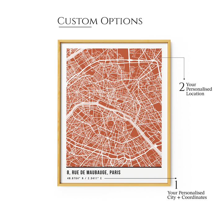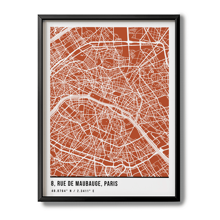 Celebrate the places that shaped your story with a personalized street map in a bold burnt orange Pantone design. From the city where you first met, to the neighborhood you call home, to a dream destination — this elegant map print transforms meaningful locations into timeless wall décor.