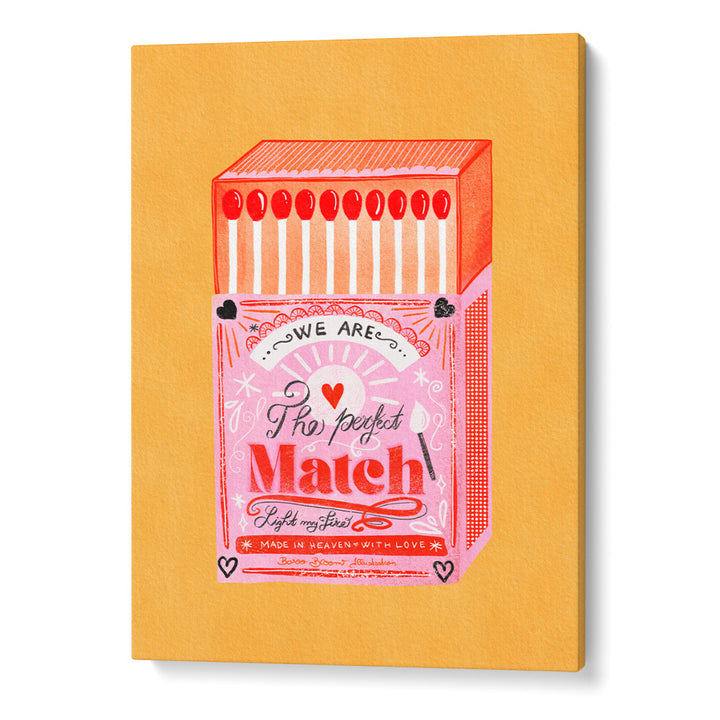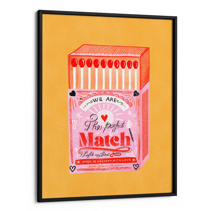 Ignite the romance with The Perfect Match Box Wall Art poster. This charming, vintage-style graphic print features a detailed illustration of a matchbox, adorned with the heartfelt quote "We Are... The Perfect Match". The warm color palette of pink, red, and golden yellow creates a delightful, retro vibe. It's an ideal piece of kitchen or bedroom art and makes a wonderful, unique anniversary or wedding gift.