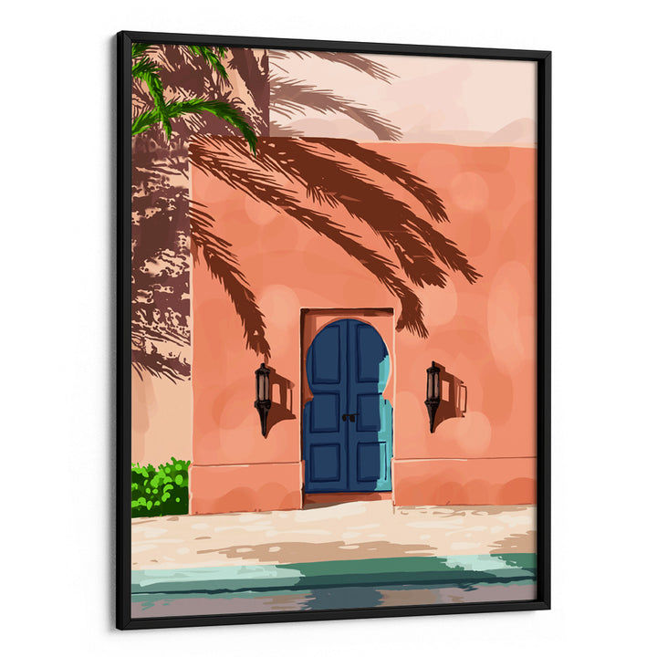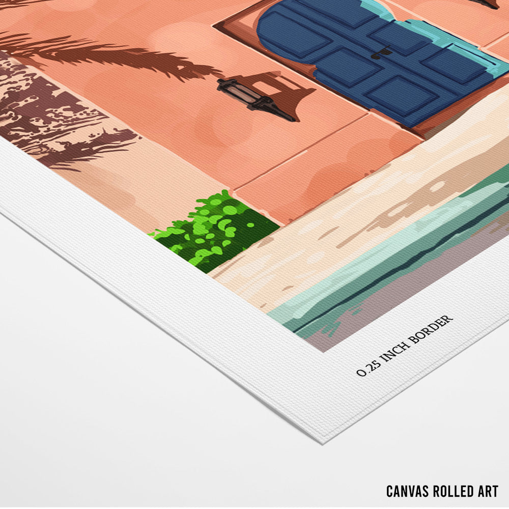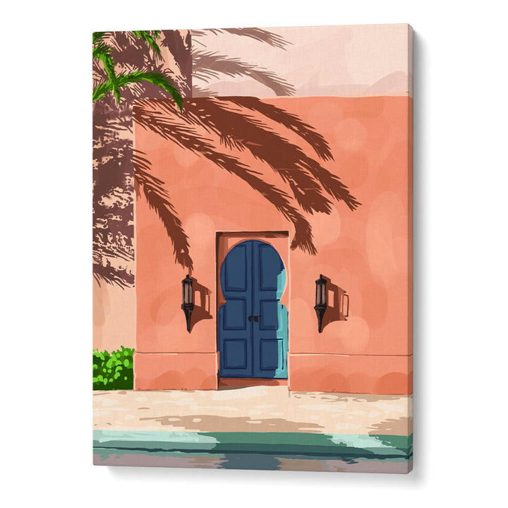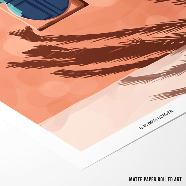 Bring Mediterranean calm into your space with Medina Sun, a soothing Bedroom wall art piece featuring a sunlit peach-toned villa, deep blue arched doors, and tropical palm shadows. This artwork blends warmth, architecture, and tranquility—perfect for bedrooms, cozy corners, or relaxing reading spaces. Its soft colors and minimal yet elegant composition make it versatile for modern, boho, and aesthetic interiors.