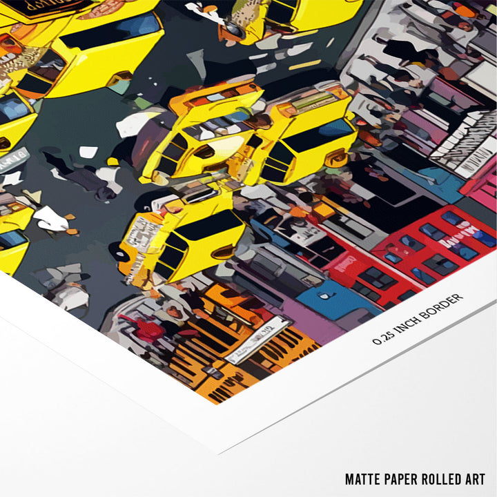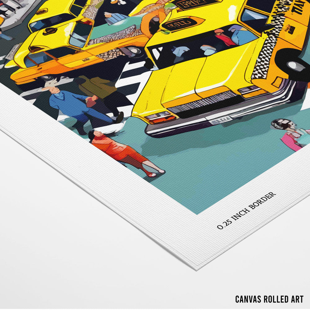 - Iconic New York Vibes – classic yellow cabs, bustling streets, and city architecture in one dynamic art piece.