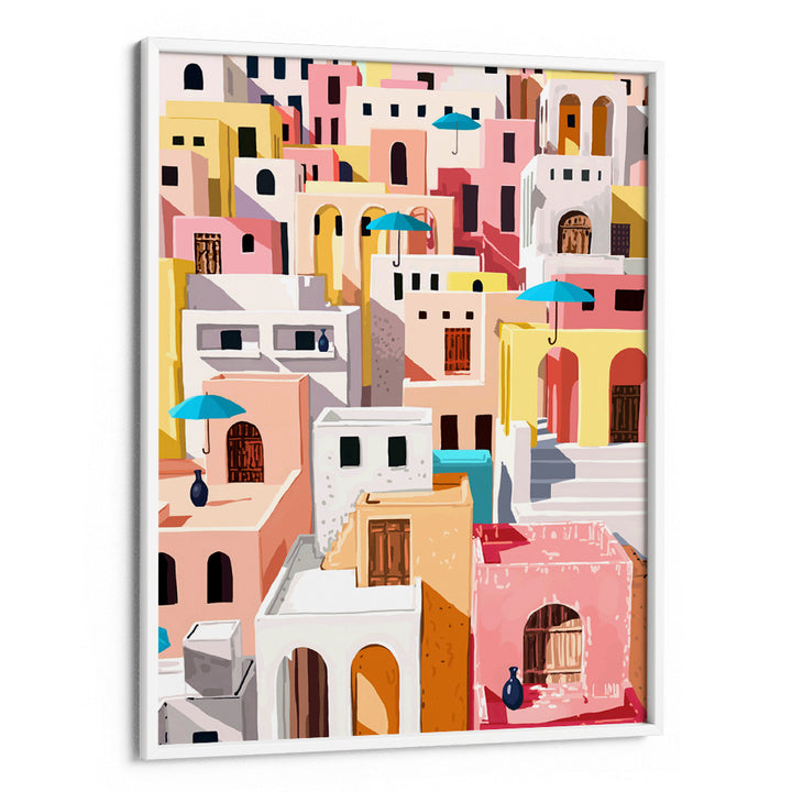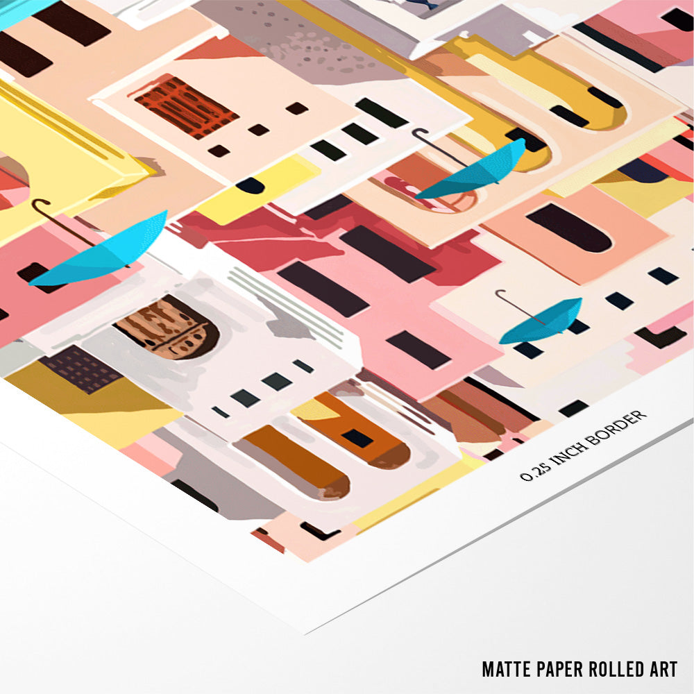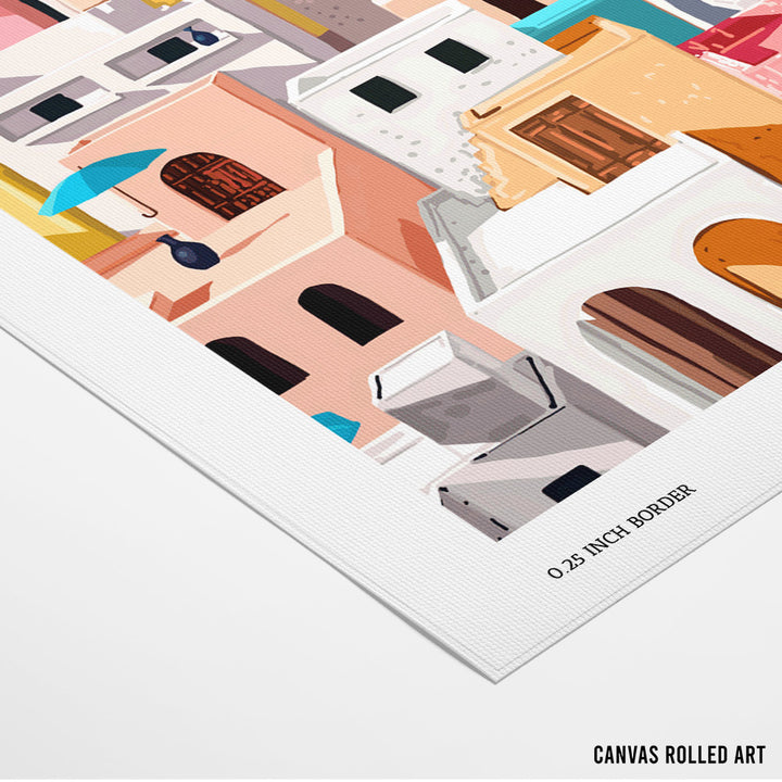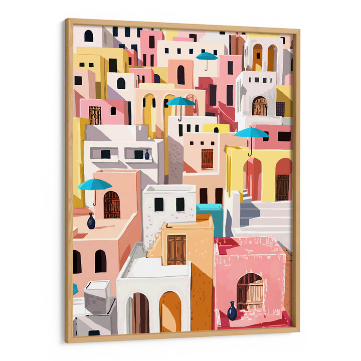 Transport yourself to a sun-drenched coastal town with the Pastel Cityscape canvas painting. This vibrant artwork captures a densely packed village of cubist architecture rendered in soft, warm shades of pink, yellow, and peach. The geometric rooftops, shadowed doorways, and charming accents like bright blue umbrellas make this piece a perfect blend of modern cityscape wall art and Mediterranean charm, ideal for adding color and character to any space.