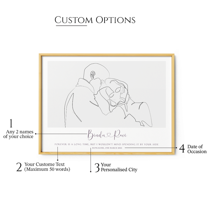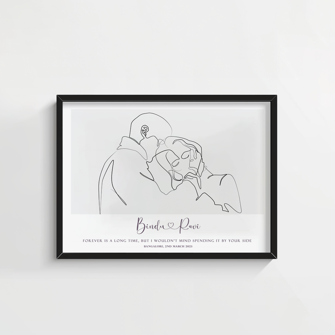 Celebrate the closeness of your relationship with this exquisite Personalized Line Art print in the 'Affection' style. This beautiful, continuous line drawing captures a tender embrace, symbolizing comfort, love, and intimacy between a couple. Customize this timeless piece with your names (like Kiranjot & Vishal), a special date (22 February 2020), and a cherished quote to create a truly bespoke keepsake. It’s the perfect minimalist art piece for celebrating a special bond.