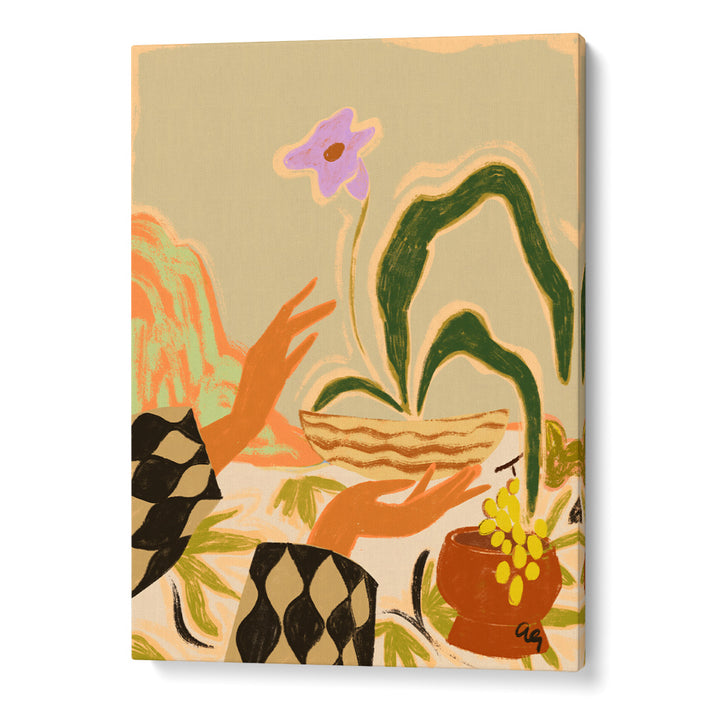 boho art, serene canvas, mindful living wall art, earthy tone artwork, botanical boho prints, symbolic offering art, meditation room decor, bohemian style wall poster