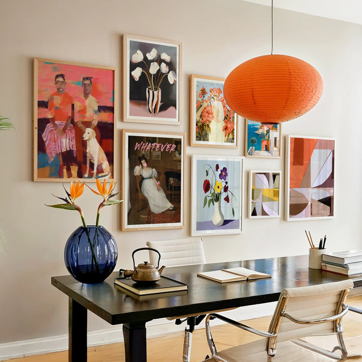 - Eight curated artworks thoughtfully arranged to create a balanced gallery wall.