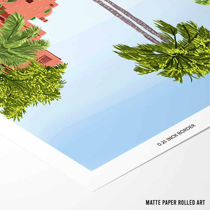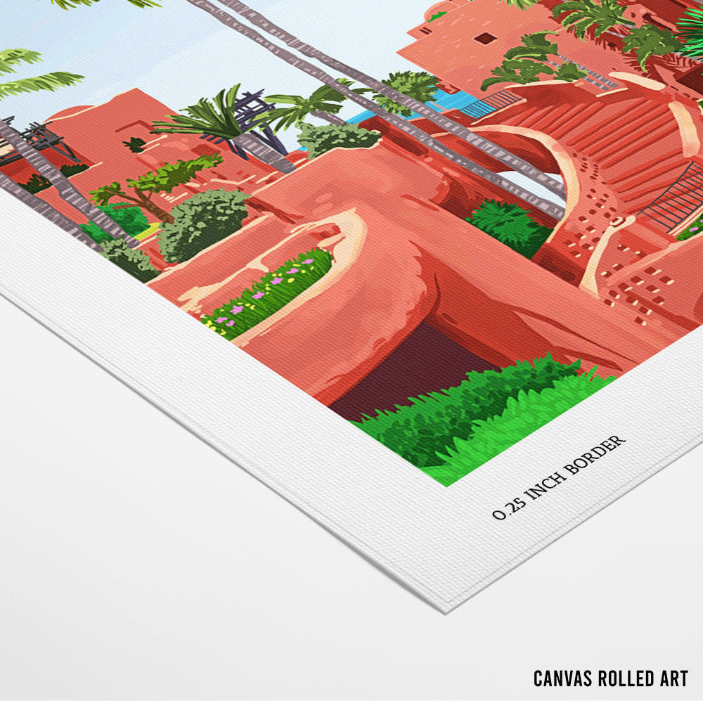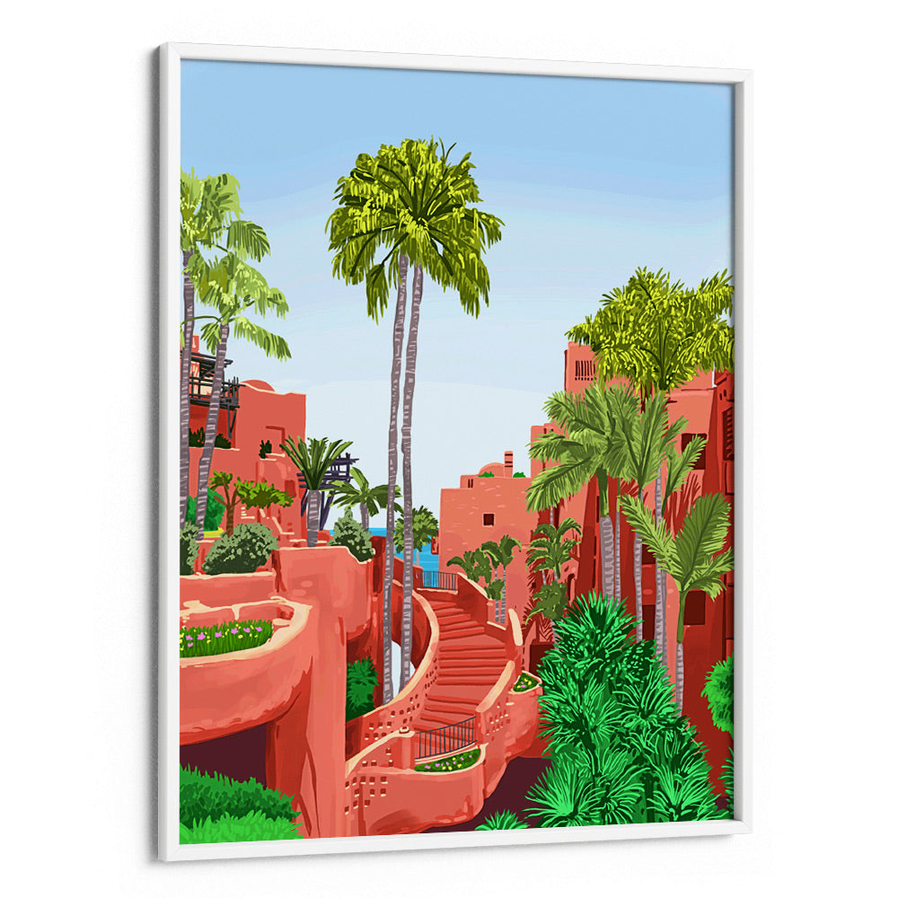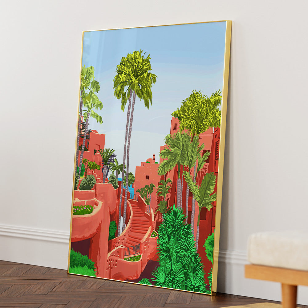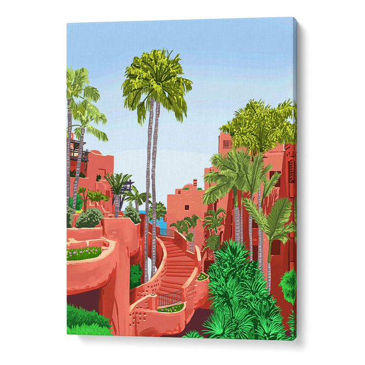 Travel wall art prints, terracotta architecture art, tropical illustration canvas, wanderlust artwork, resort-style painting, modern travel decor, lush greenery art, vacation-inspired home décor