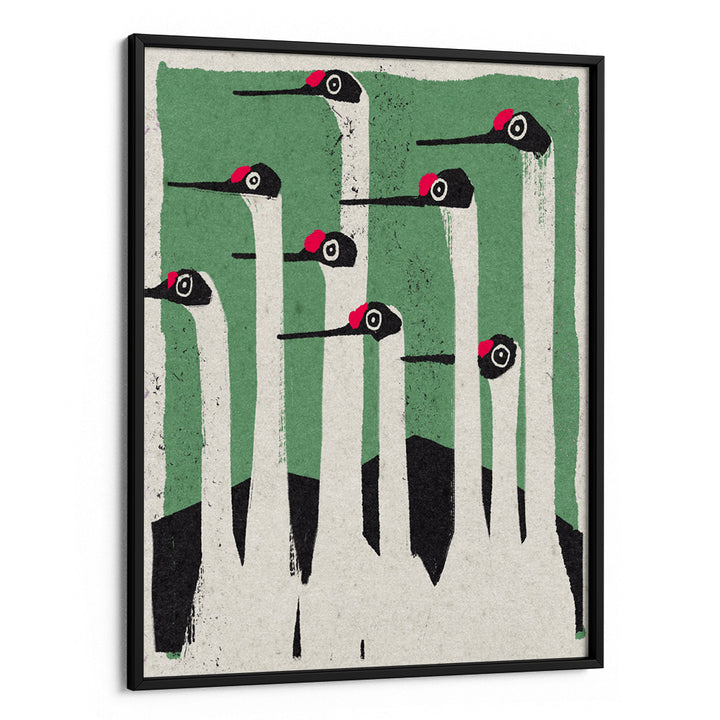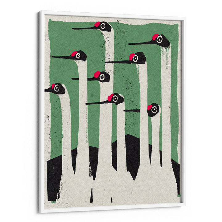 Make a sharp, modern statement with The Flock. This striking wall art print features a group of stylized white birds (likely cranes or storks) with minimalist black and red accents, set against a bold, textured green background. The graphic, simplified forms and strong vertical composition give this piece a distinct Mid-Century Modern or vintage poster aesthetic. It's perfect for adding architectural elegance, natural simplicity, and a pop of unique color to your living space, hallway, or modern office.