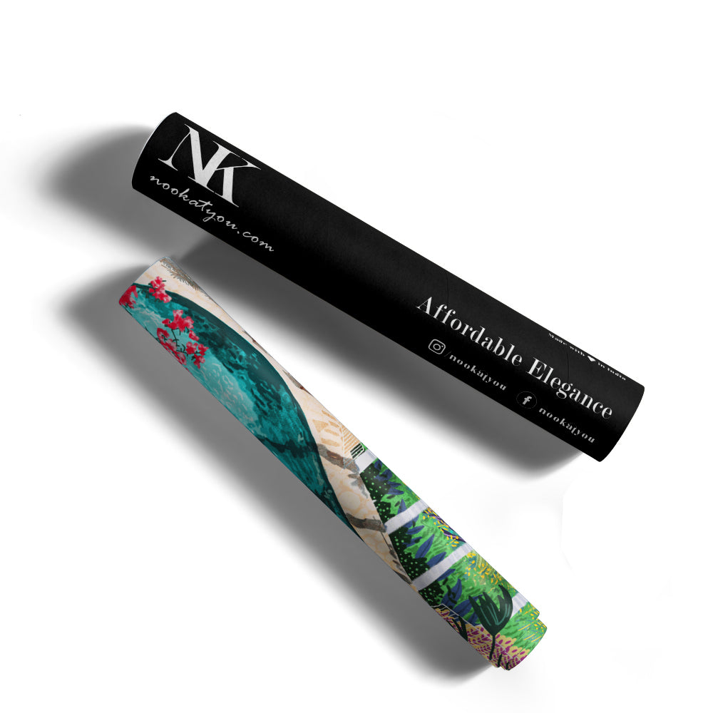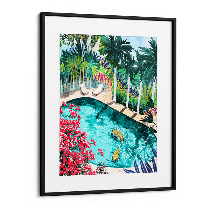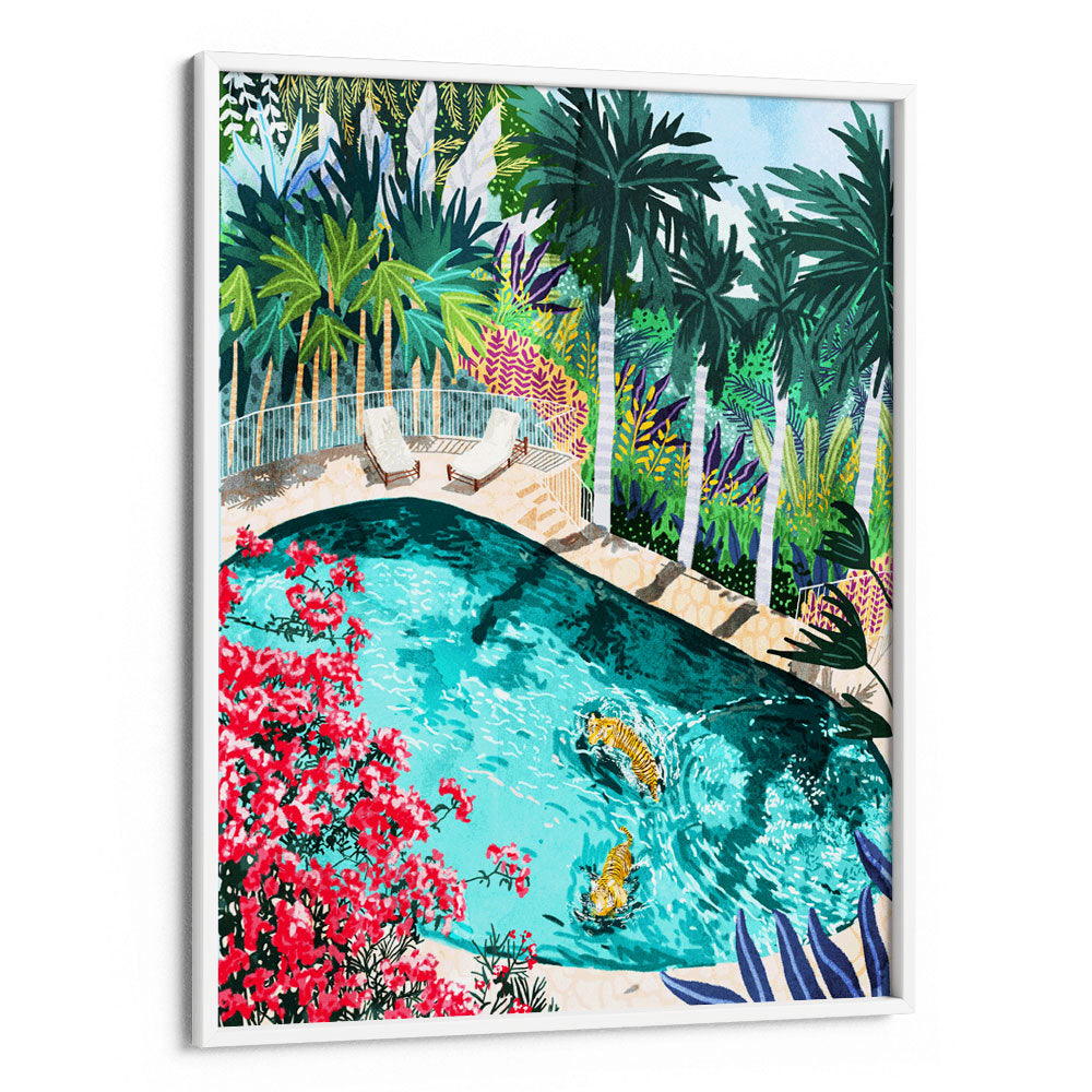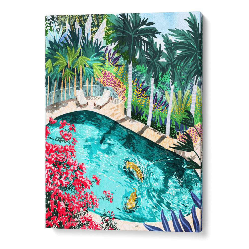 Bring home the charm of Mediterranean summers with Tigers In Greece, a stunning piece of Botanical wall art featuring lush greenery, blooming pink florals, and a serene turquoise pool. Two playful tigers glide through the water, creating a blend of whimsy, wilderness, and vacation-style calm. This artwork is perfect for brightening modern homes, creative corners, reading nooks, and relaxing spaces.