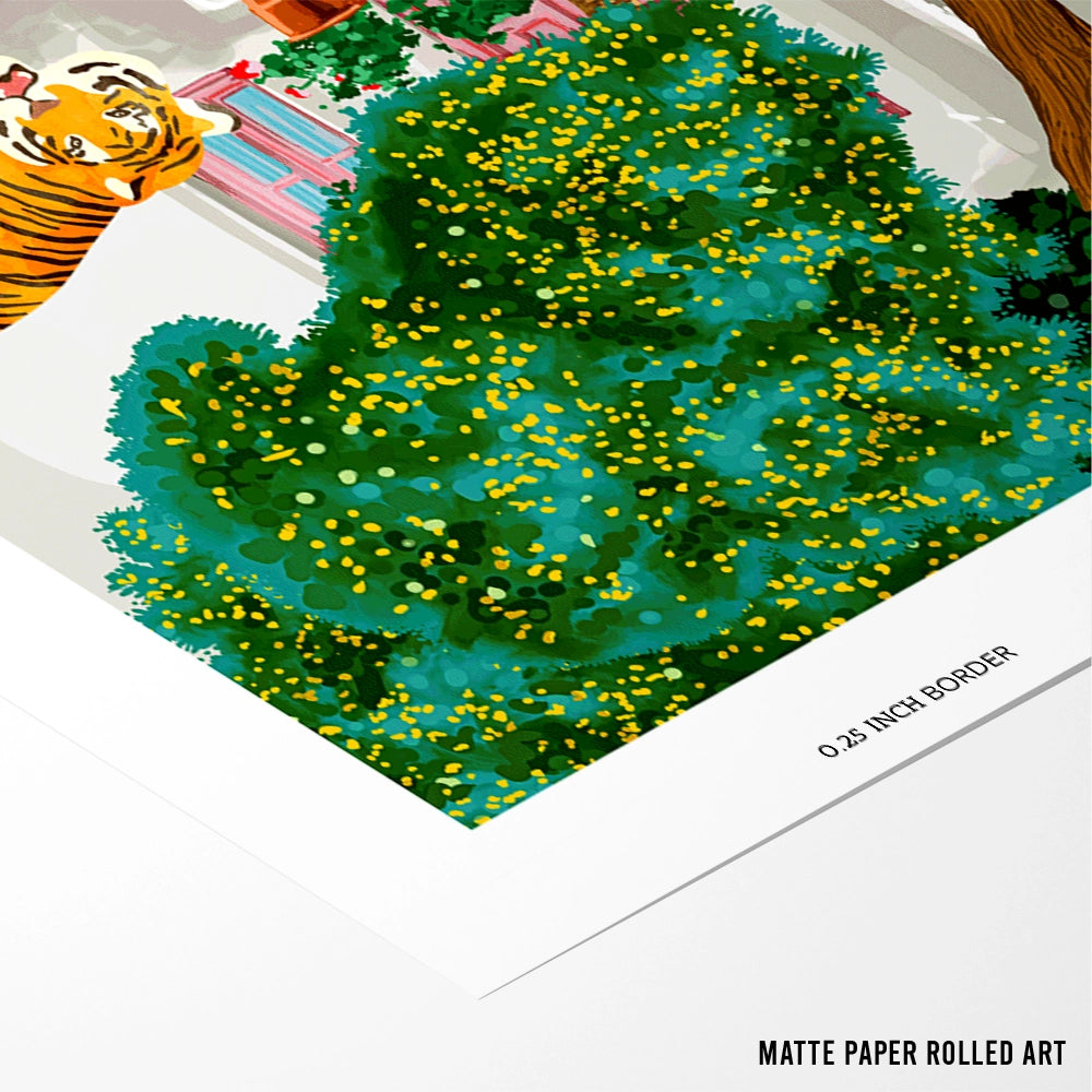 Bring home the charm of Mediterranean summers with Tigers In Greece, a stunning piece of Botanical wall art featuring lush greenery, blooming pink florals, and a serene turquoise pool. Two playful tigers glide through the water, creating a blend of whimsy, wilderness, and vacation-style calm. This artwork is perfect for brightening modern homes, creative corners, reading nooks, and relaxing spaces.