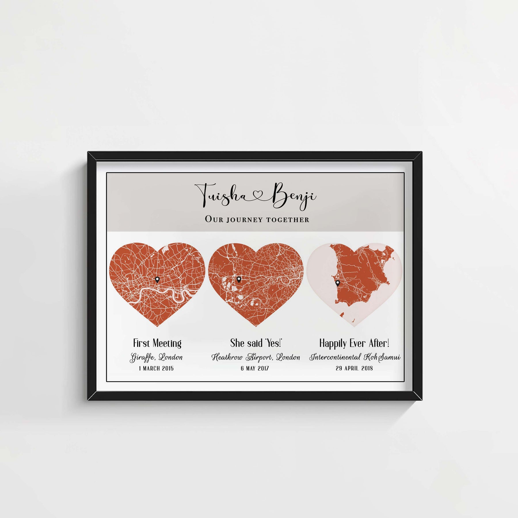This custom triple heart map is a sentimental way to tell your story. Display it in your bedroom, living room, or study to keep your journey alive. Pair it with our personalized star map print for the perfect love story set.