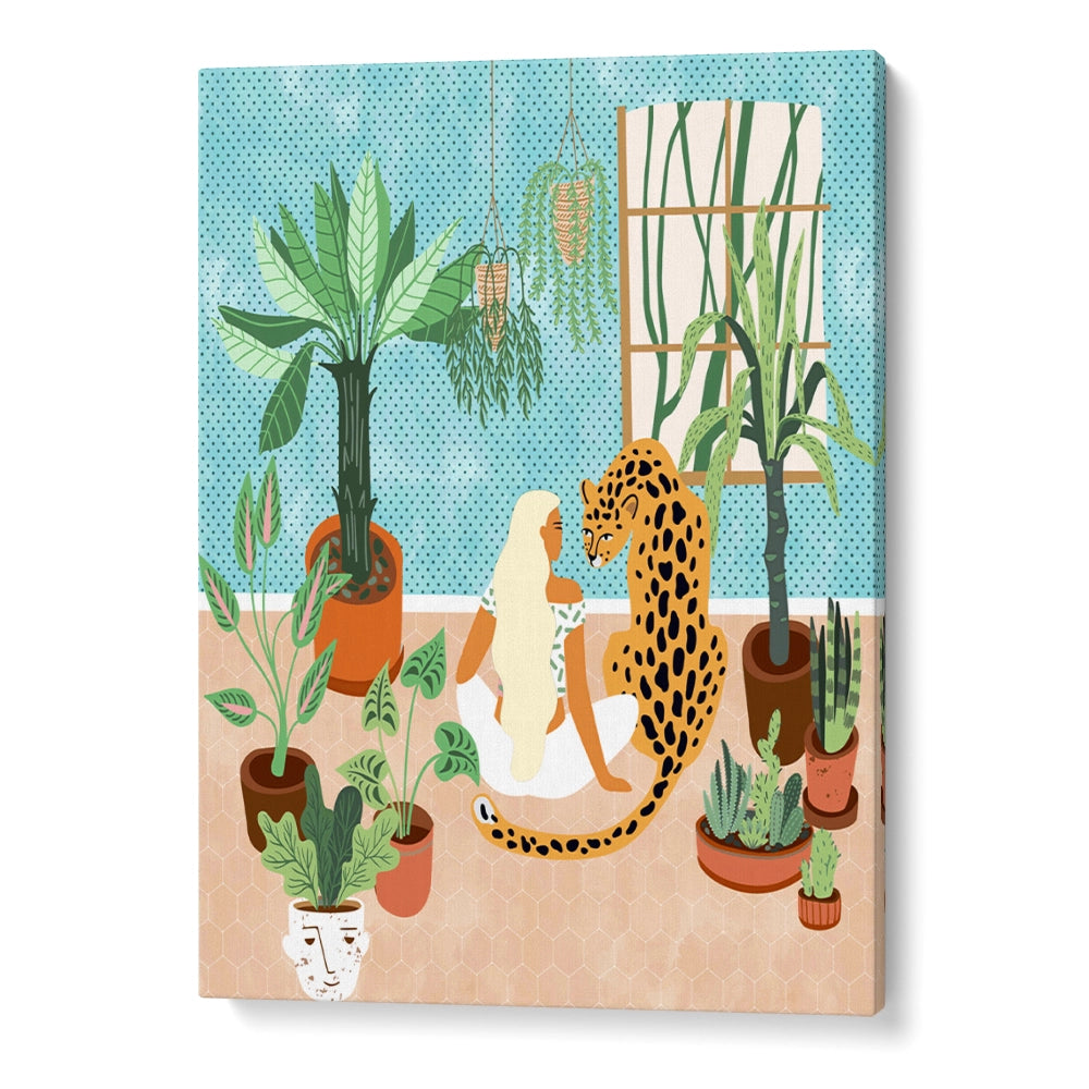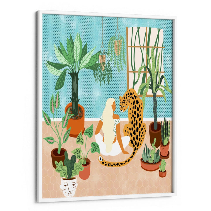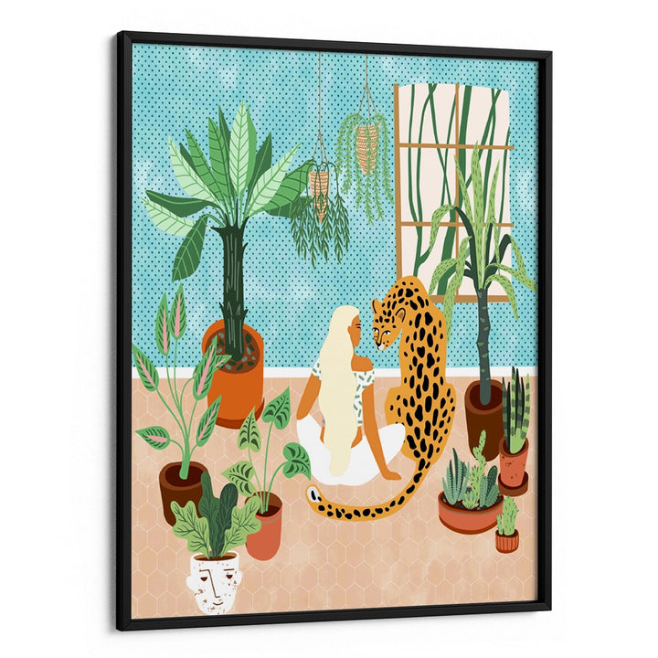 Bold, imaginative, and delightfully unexpected, Urban Jungle is a contemporary Boho art design that blurs the line between indoor living and wild nature. Set within a plant-filled interior, this artwork brings together lush greenery, a calm human presence, and a striking leopard motif—symbolising harmony, curiosity, and untamed energy in modern spaces. Perfect for creative homes, this piece adds personality, colour, and storytelling to your walls.