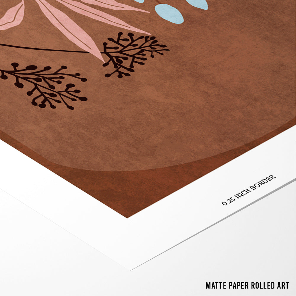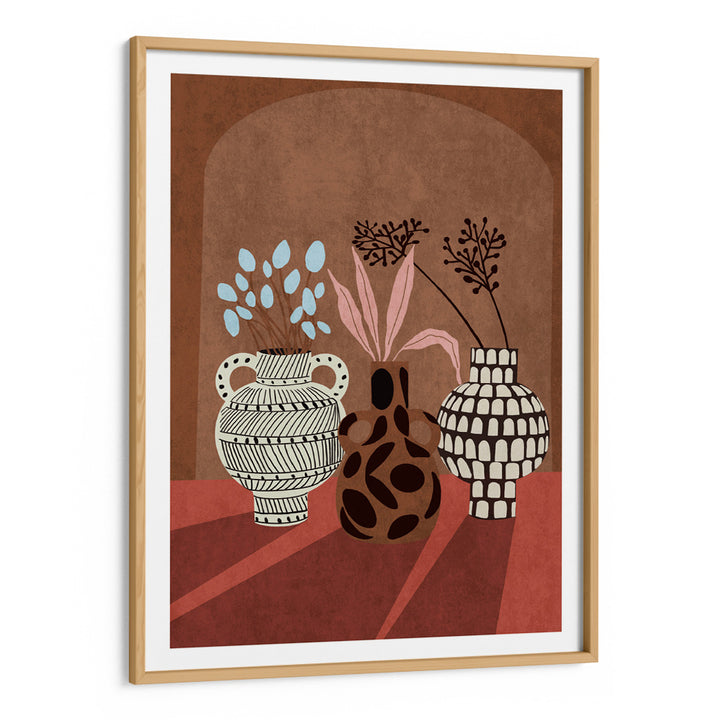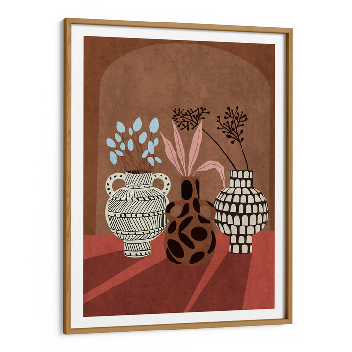 Bring a grounded, artisanal warmth to your walls with Vases of Verona, a bold and graphic boho art print featuring three distinct ceramic vases. Set against a curved archway and rich terracotta-toned table, each vase is adorned with abstract detailing and soft botanical sprigs in pastel pinks and powder blues. This piece balances retro charm with earthy textures—perfect for styling in modern Indian homes that celebrate slow living and natural design.