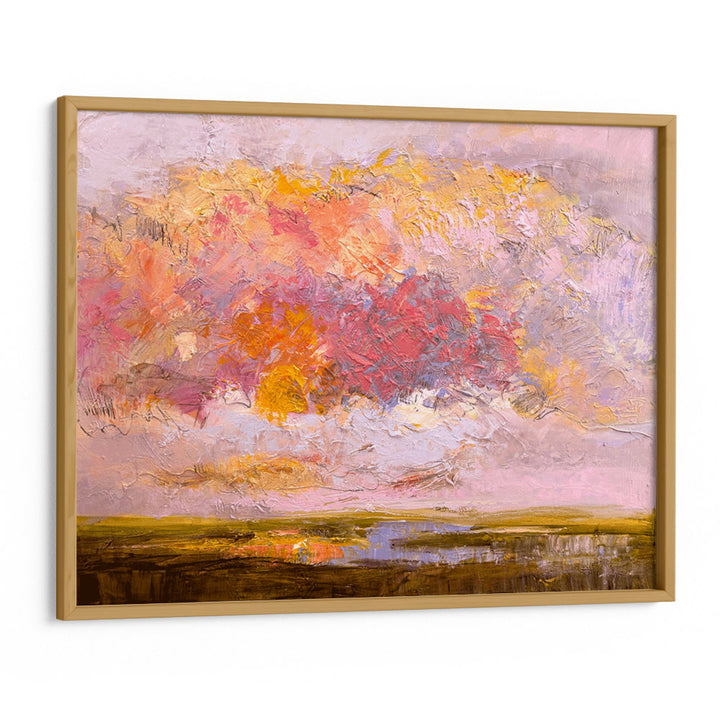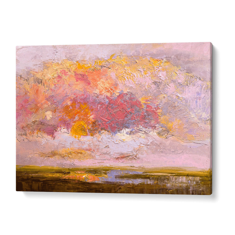 Bring the drama of a sunset into your home with the Vibrant Pink Horizon canvas print. This striking horizontal piece is a highly textured abstract landscape featuring heavy impasto brushwork, creating tactile, cloud-like forms in vibrant pink, golden yellow, and soft lavender. The vibrant sky contrasts beautifully with the dark, reflective foreground, suggesting a peaceful yet intense sunset or sunrise over water. This canvas print is a perfect statement piece for adding dynamic color, visual texture, and a modern impressionistic feel to a living room or bedroom.