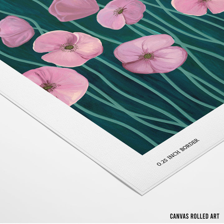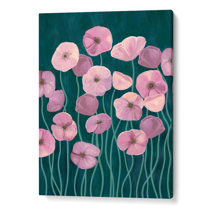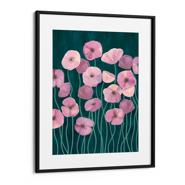 Bring an element of playful elegance to your walls with the Whimsical Blossoms Wall Art Poster. This enchanting piece features stylized, soft pink poppy-like flowers floating on long, fluid stems. The striking contrast is created by the deep teal or dark blue-green background, giving the painting a contemporary, jewel-toned depth. With a dreamy, whimsical style, this vertical poster is perfect for adding a pop of feminine color, botanical charm, and modern artistry to a bedroom, nursery, or creative studio.