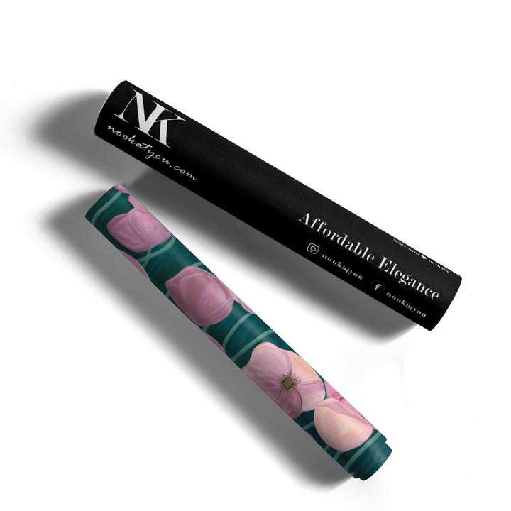 - Striking Color Contrast between soft pink florals and a deep teal background.